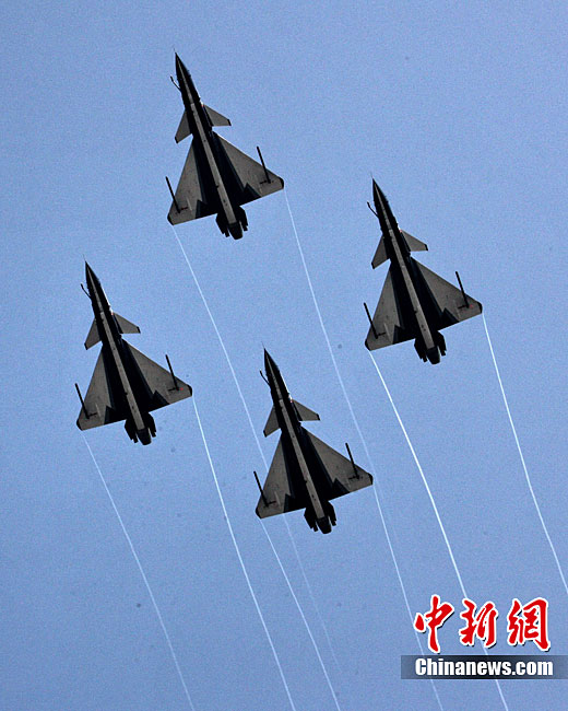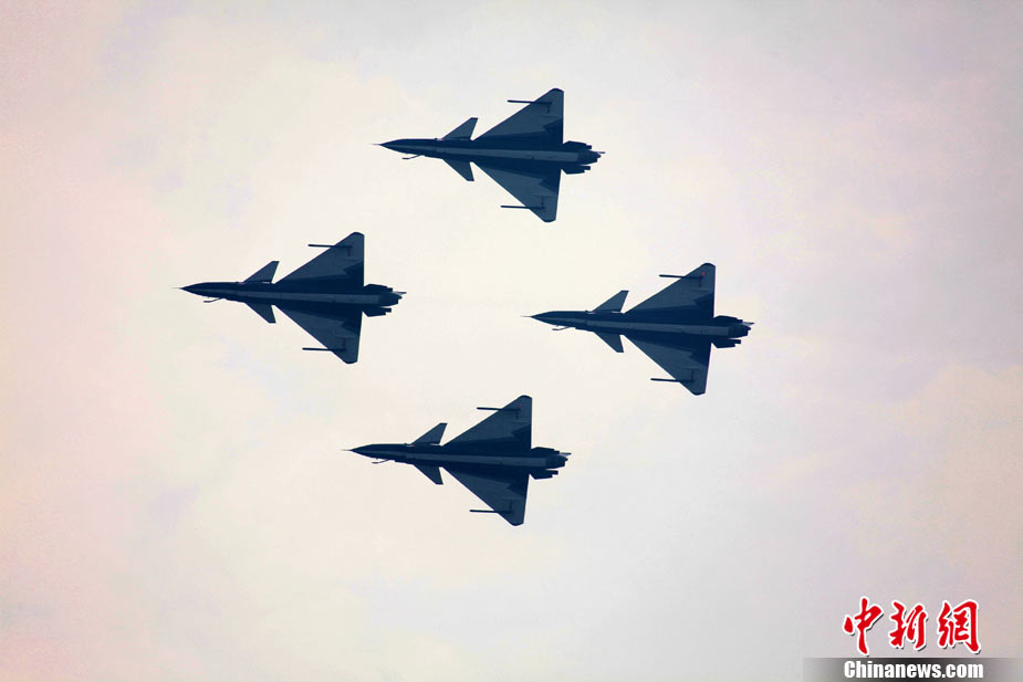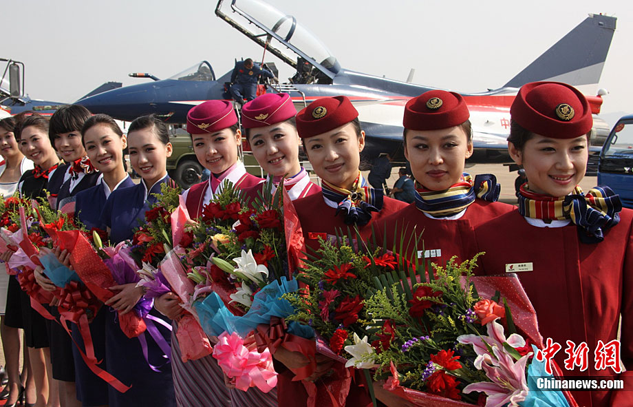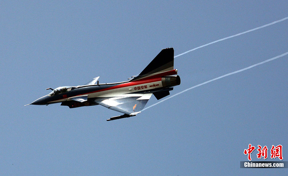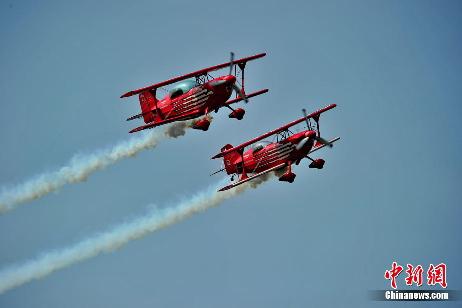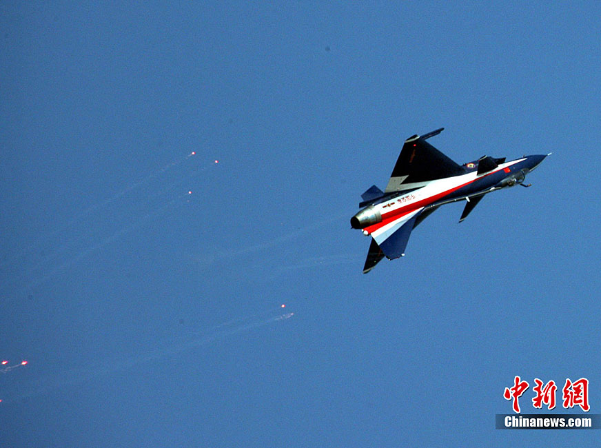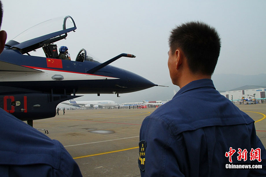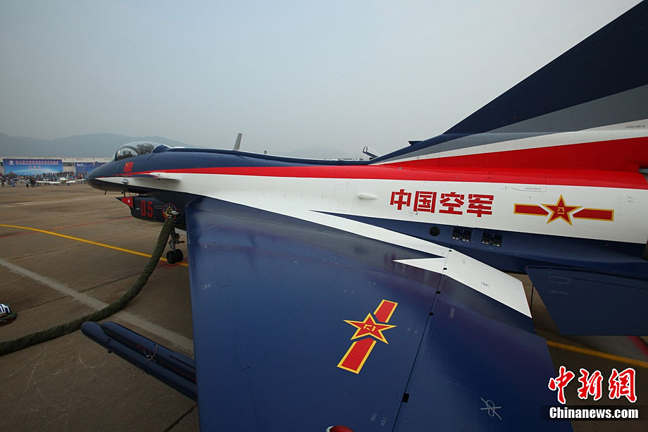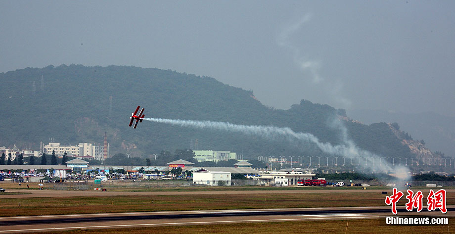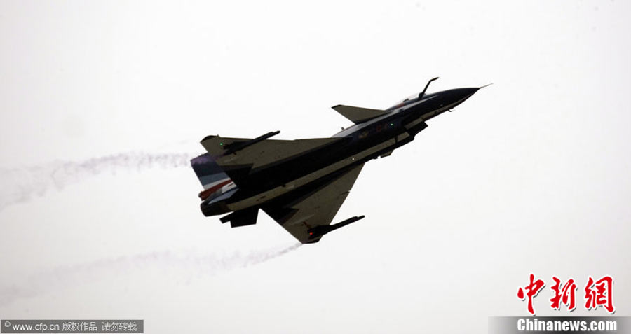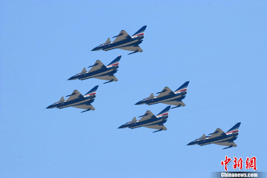 11月19日,在珠海第8屆中國國際航空航天博覽會上,巴基斯坦空軍雄獅飛行表演隊的空中英豪們駕駛k8教練機,憑借高超的飛行技藝,以珠海機場上空為舞臺,承、轉、啟、合,任意揮灑,給觀看的中外賓客以視覺享受。中新社發 喬天富 攝 圖片來源:CNSPHOTO
