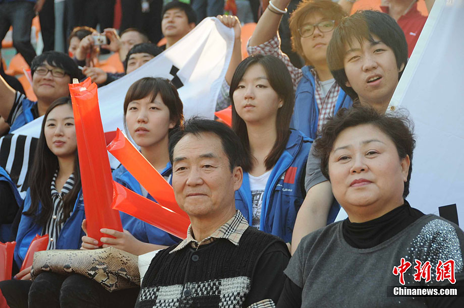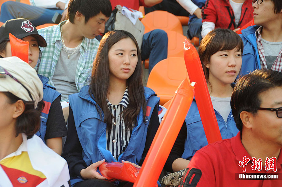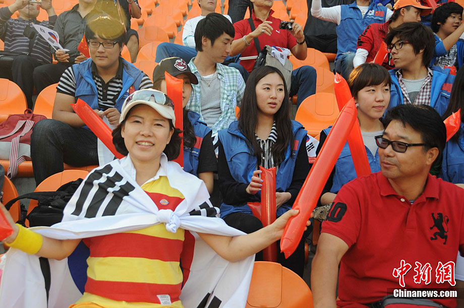 廣州亞運會女子足球賽中國隊與韓國隊的銅牌爭奪戰11月22日在廣州天河體育館開打。圖為賽場上熱情的中國球迷。中新社記者 唐貴江 攝