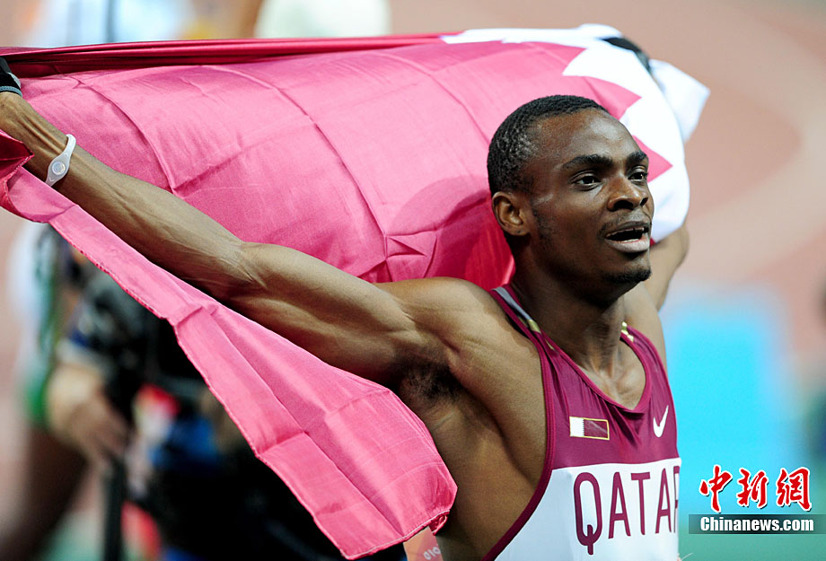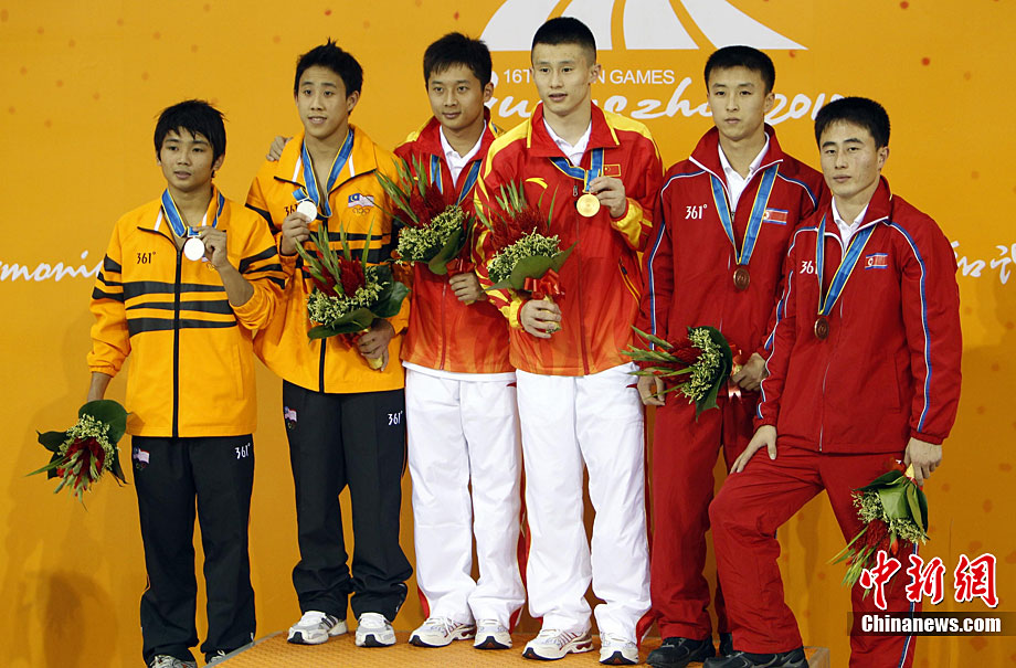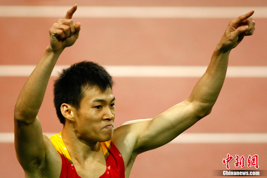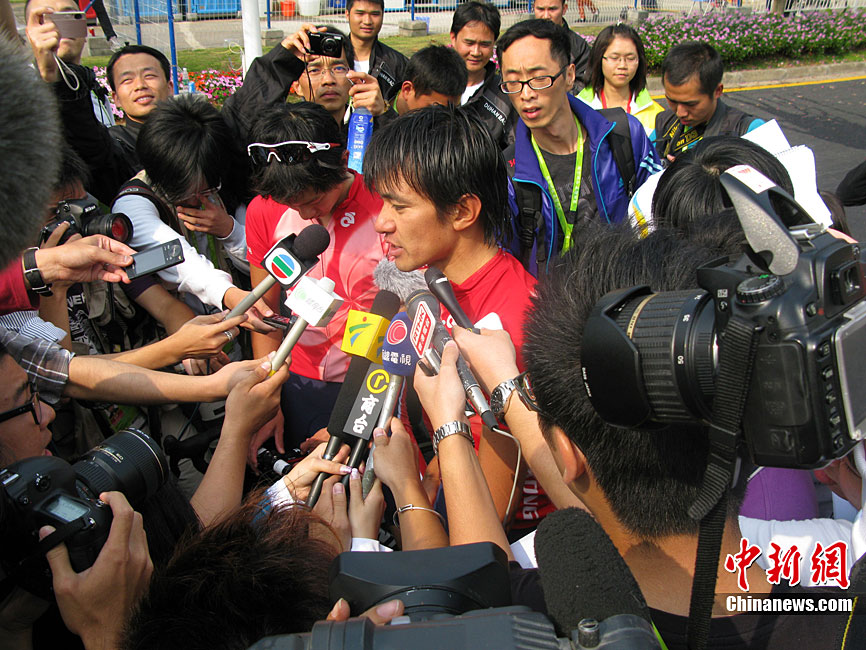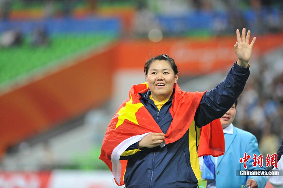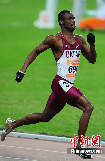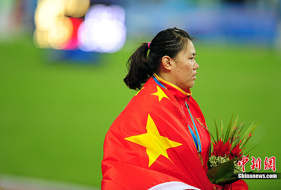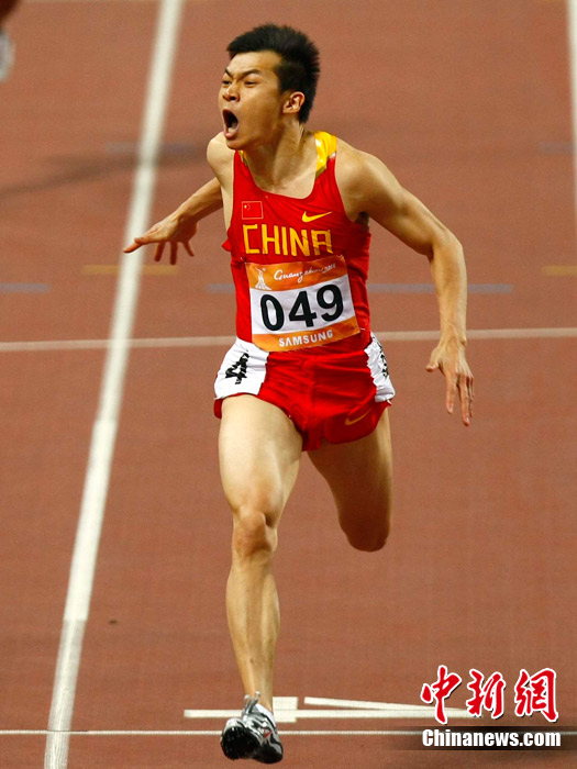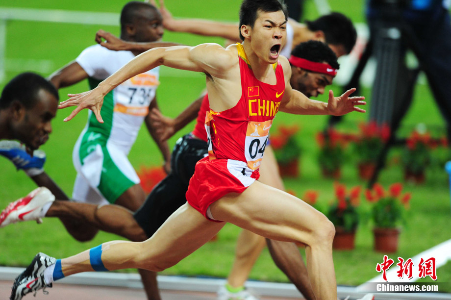 22日晚,廣州亞運會田徑男子100米決賽中,中國選手勞義奪得金牌。中新社記者 柯小軍 攝