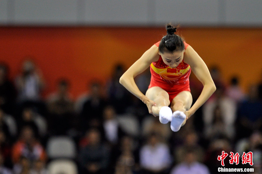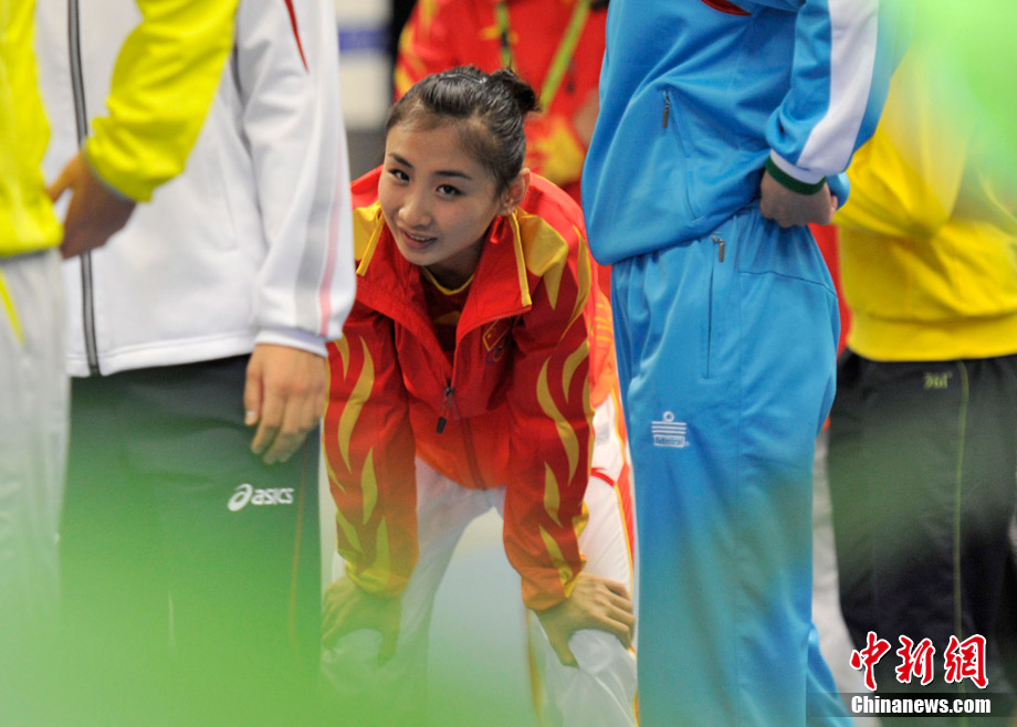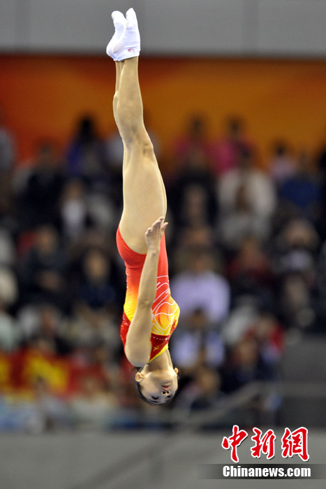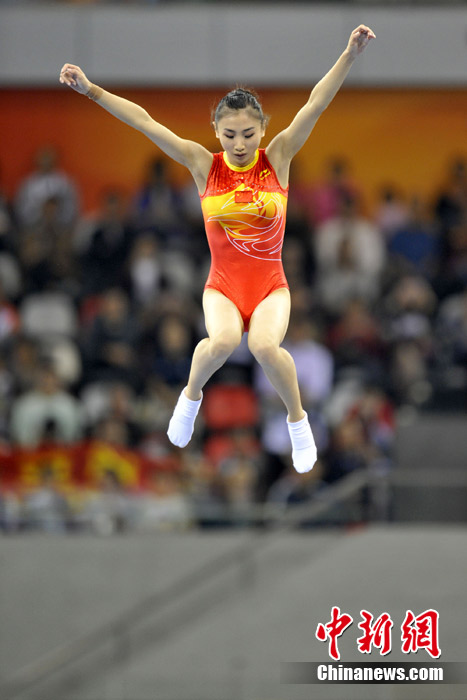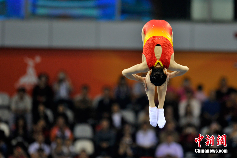11月22日,廣州亞運會蹦床決賽在亞運城體育館舉行,“蹦床公主”何雯娜總分40.90獲得銀牌,隊友黃珊汕總分41.40摘得金牌。中新網記者 金碩 攝