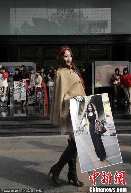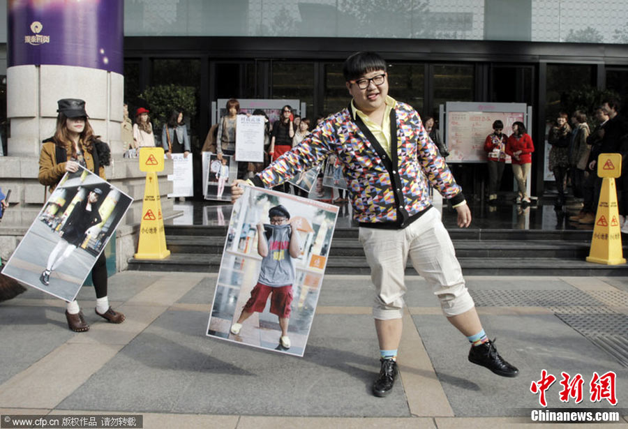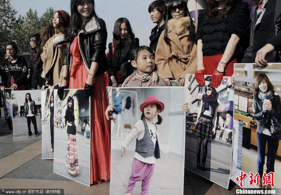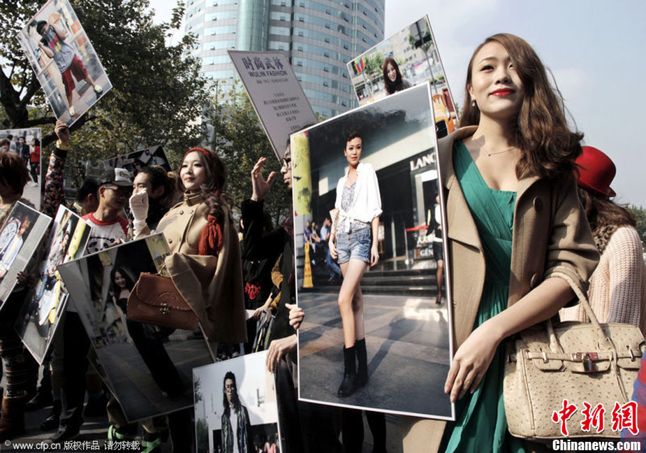 11月23日,在杭州廣場上,百余名身穿時尚服飾,化著個性妝扮的年輕人,手拿自己的靚照,走上街頭,向人們大膽展示自己的風采。右娃 攝 圖片來源:CFP視覺中國