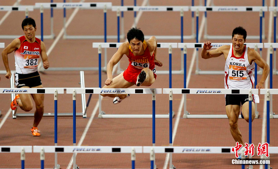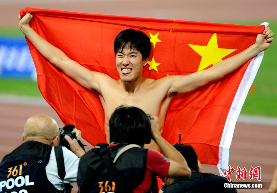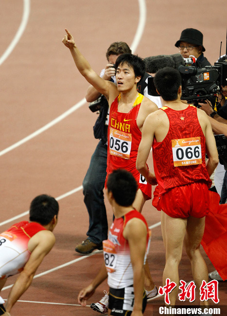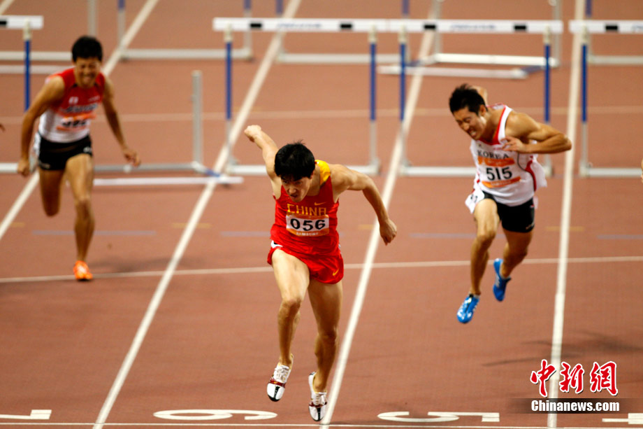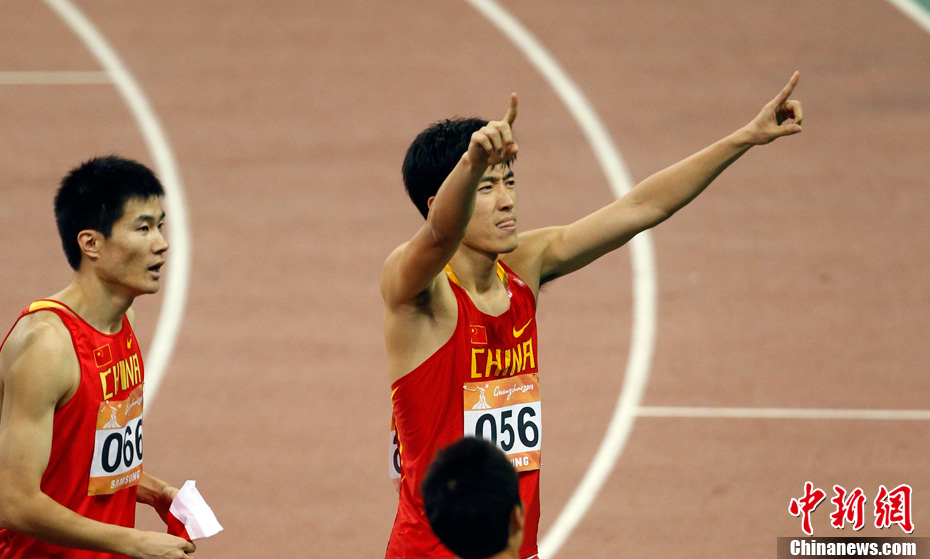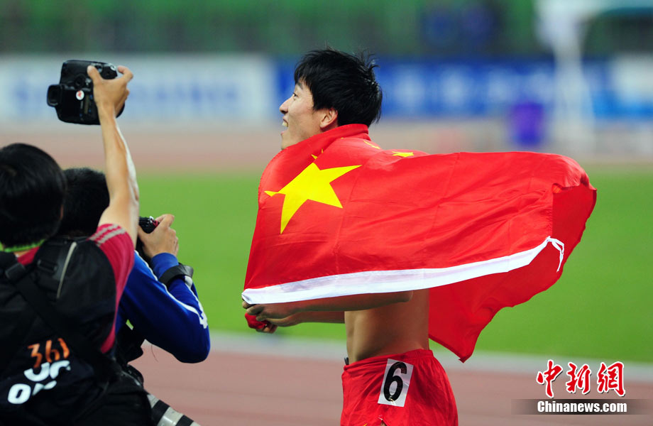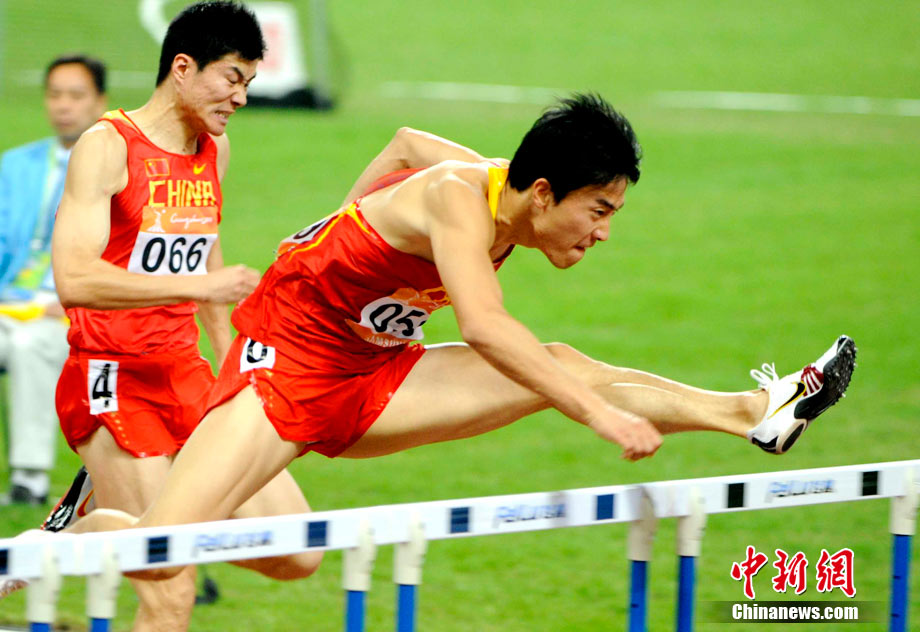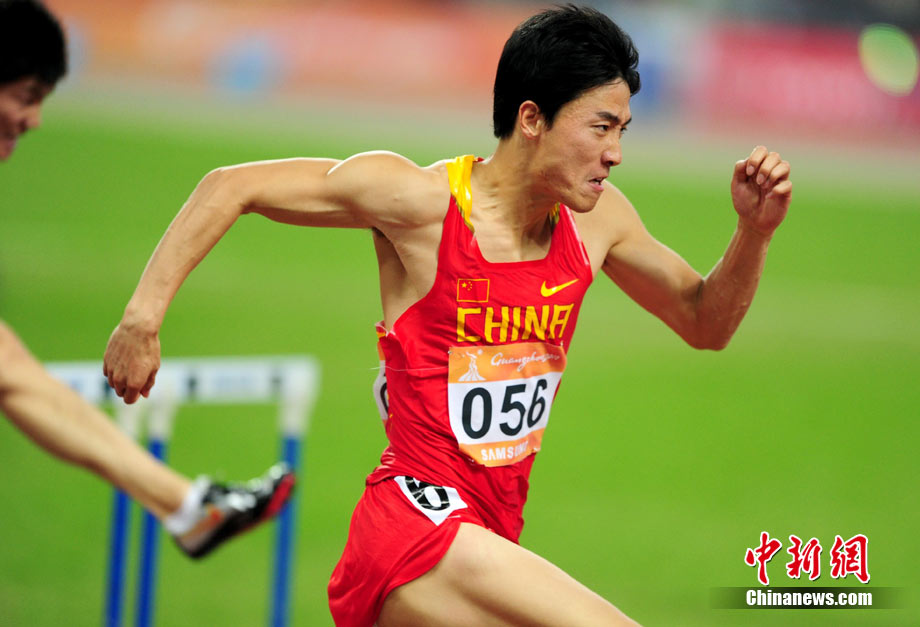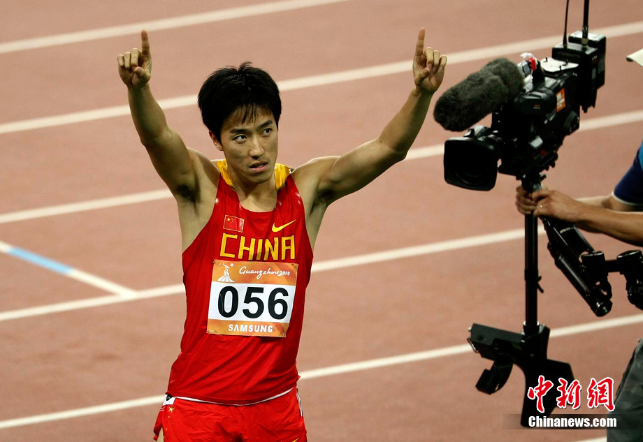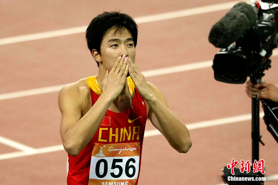 11月24日,廣州亞運會男子110米欄決賽,劉翔以13秒09的成績奪得金牌,這一成績打破了亞運會紀錄。劉翔以一場酣暢淋漓的勝利宣告了自己的回歸。中新社記者 王東明 攝