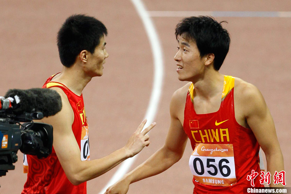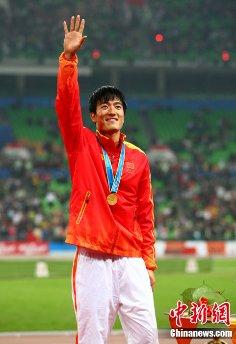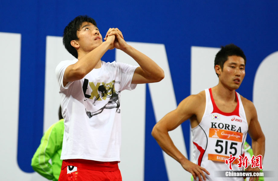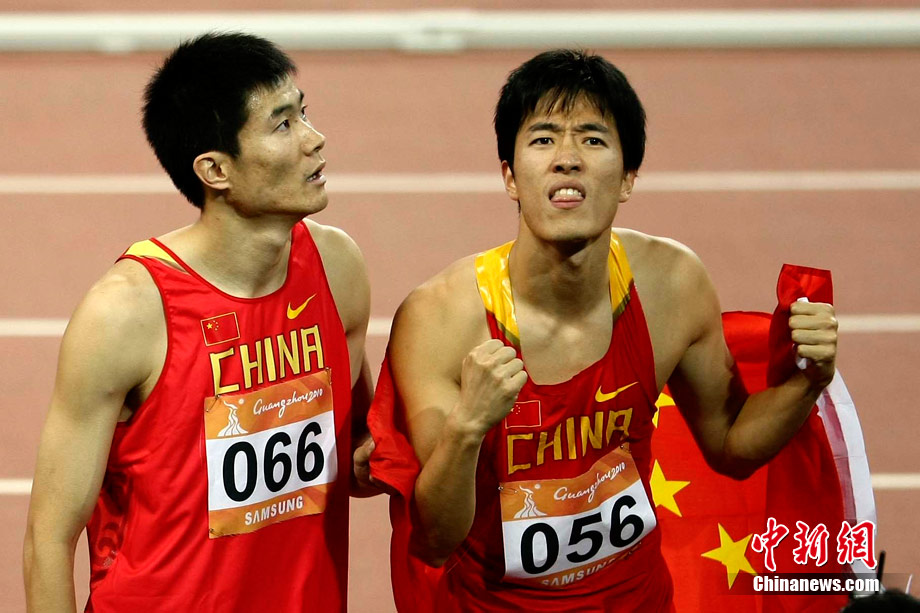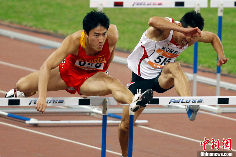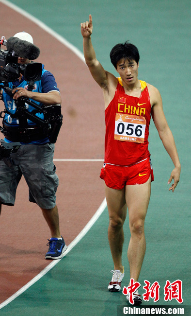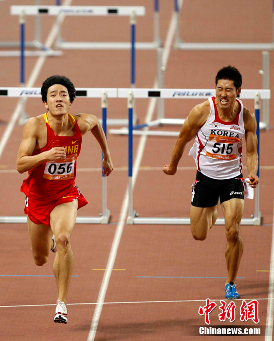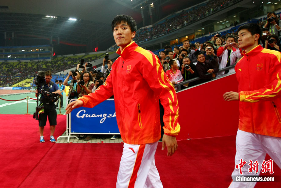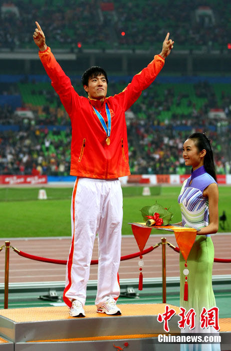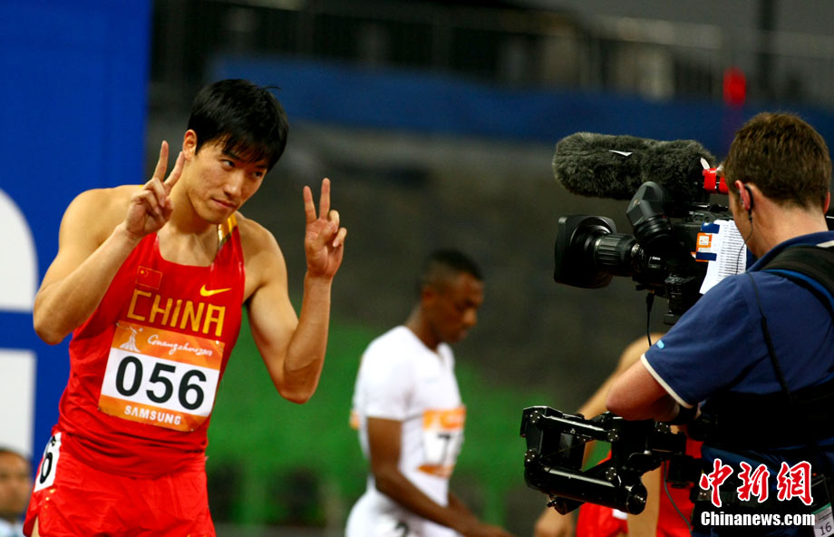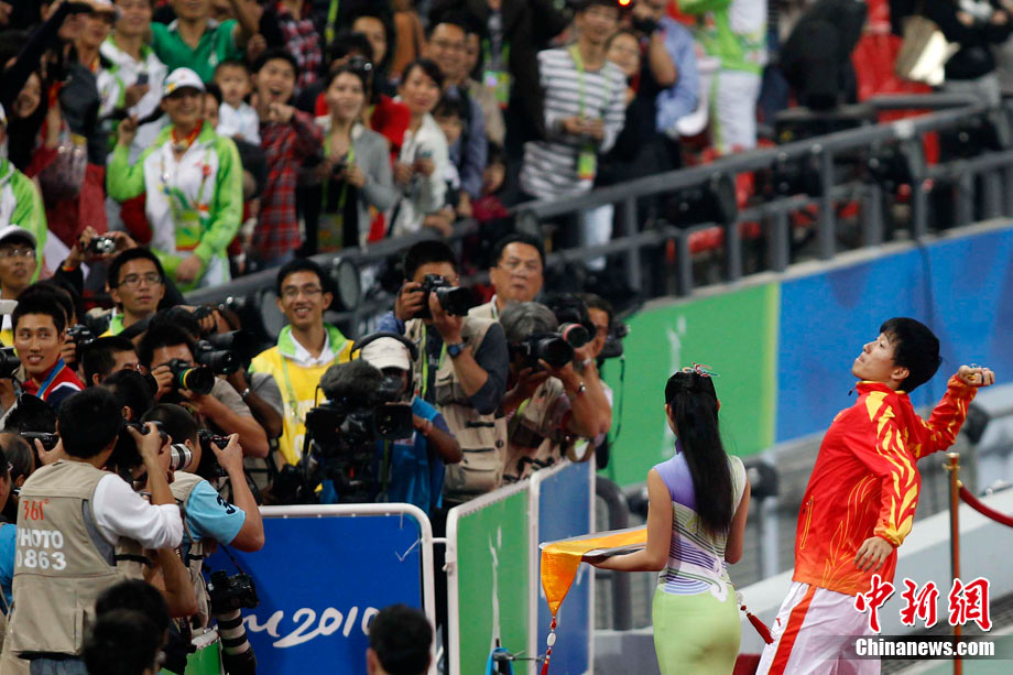 11月24日,廣州亞運會男子110米欄決賽,劉翔以13秒09的成績奪得金牌,這一成績打破了亞運會紀錄。劉翔以一場酣暢淋漓的勝利宣告了自己的回歸。中新社記者 王東明 攝