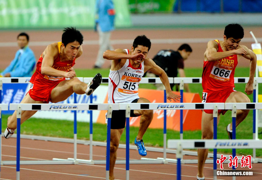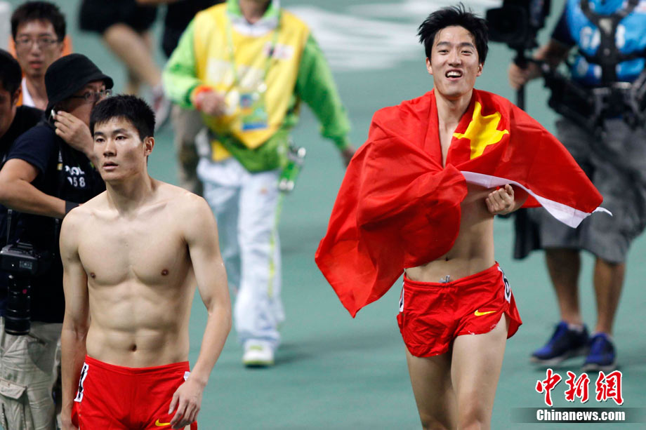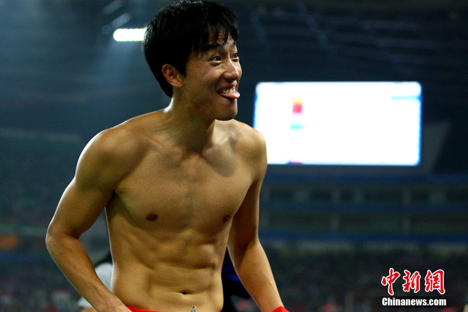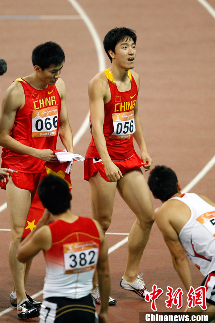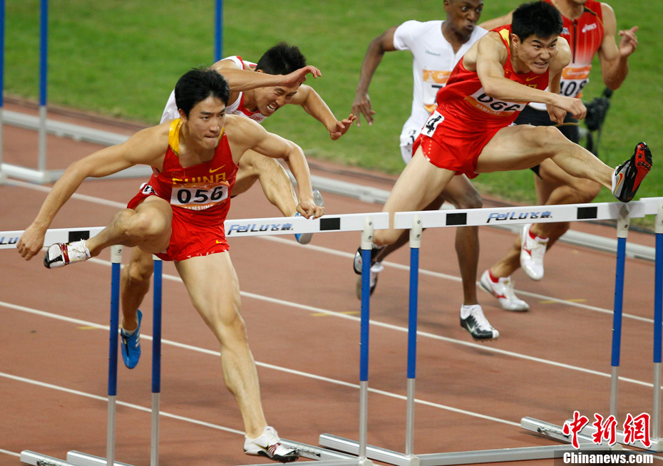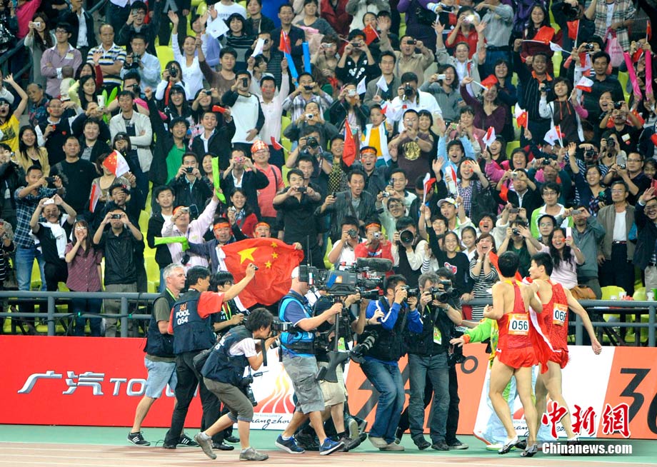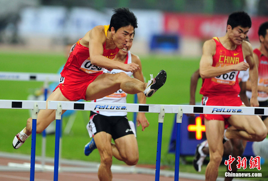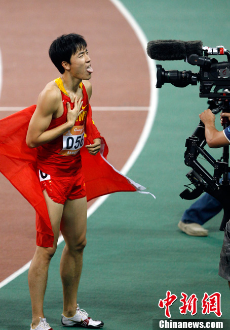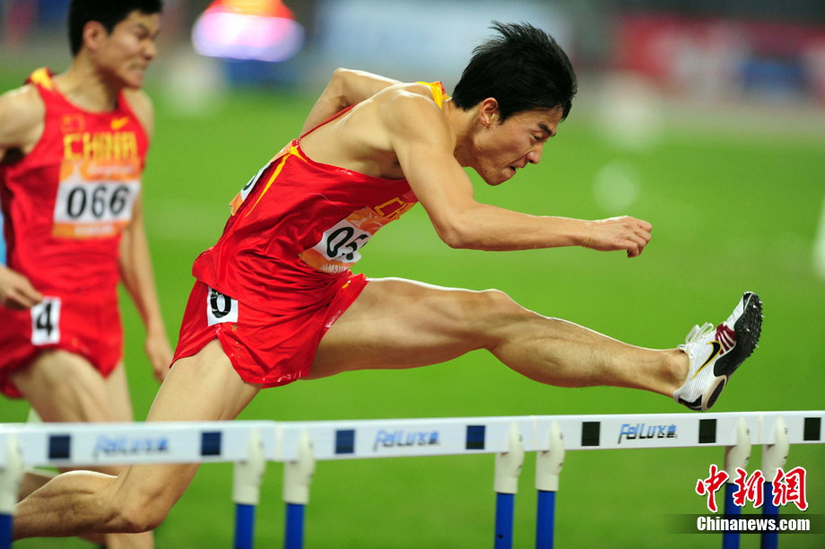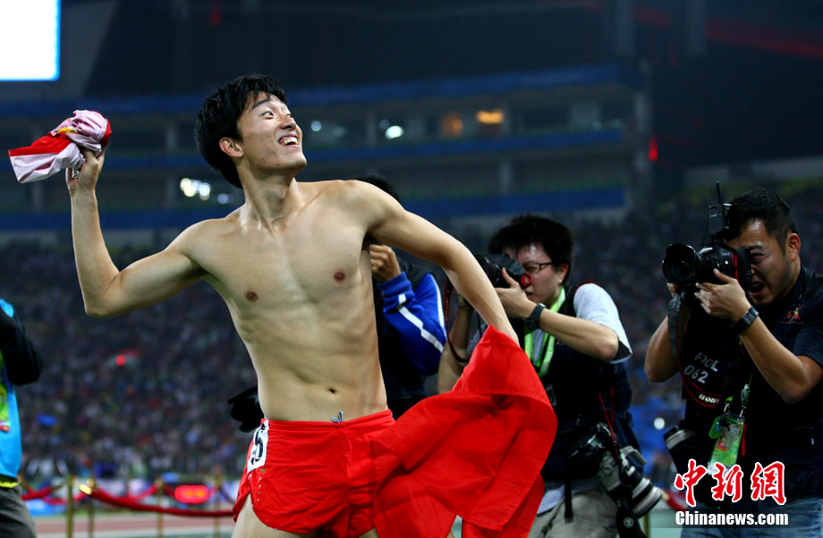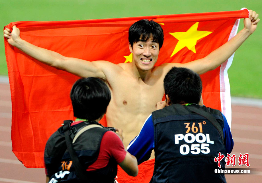 11月24日,廣州亞運會男子110米欄決賽,劉翔以13秒09的成績奪得金牌,這一成績打破了亞運會紀錄。劉翔以一場酣暢淋漓的勝利宣告了自己的回歸。中新社記者 王東明 攝