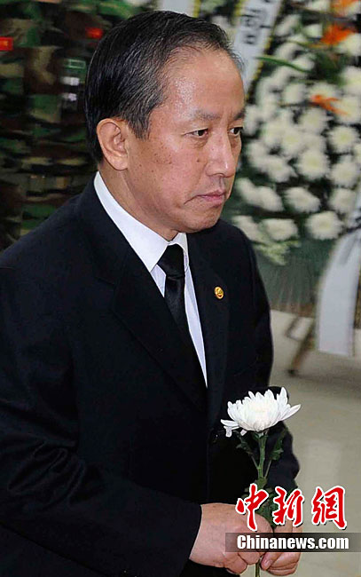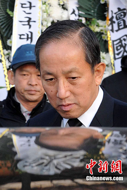 韓國總統秘書室室長任太熙11月25日在青瓦臺召開記者會說,李明博受理了金泰榮的辭呈!疤彀病迸炇录l生后,金泰榮于5月1日引咎辭職,但為了后續措施和韓美防長會談等問題,李明博一直未受理辭呈。最近,軍隊內陸續發生戰機墜落等事故,并為整頓軍內氣氛,李明博今天受理了辭呈。此外,還將替換青瓦臺國防秘書官。圖為25日韓國國防長官金泰榮前往醫院看望因朝韓“炮戰”受傷人員。