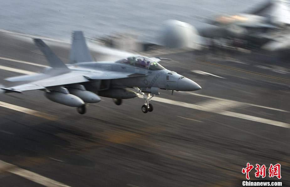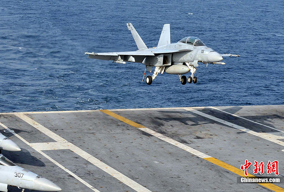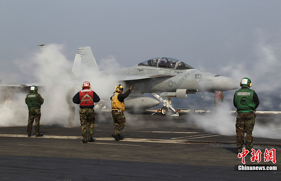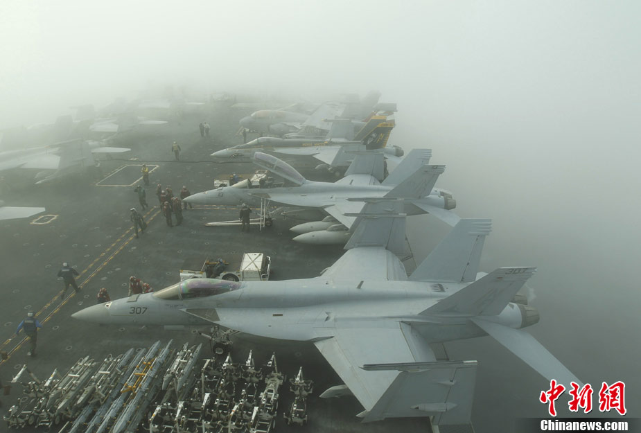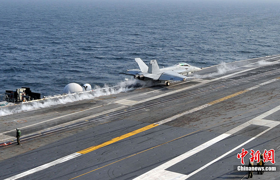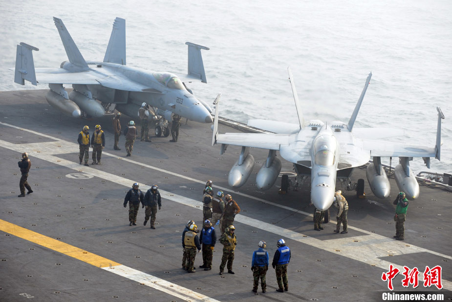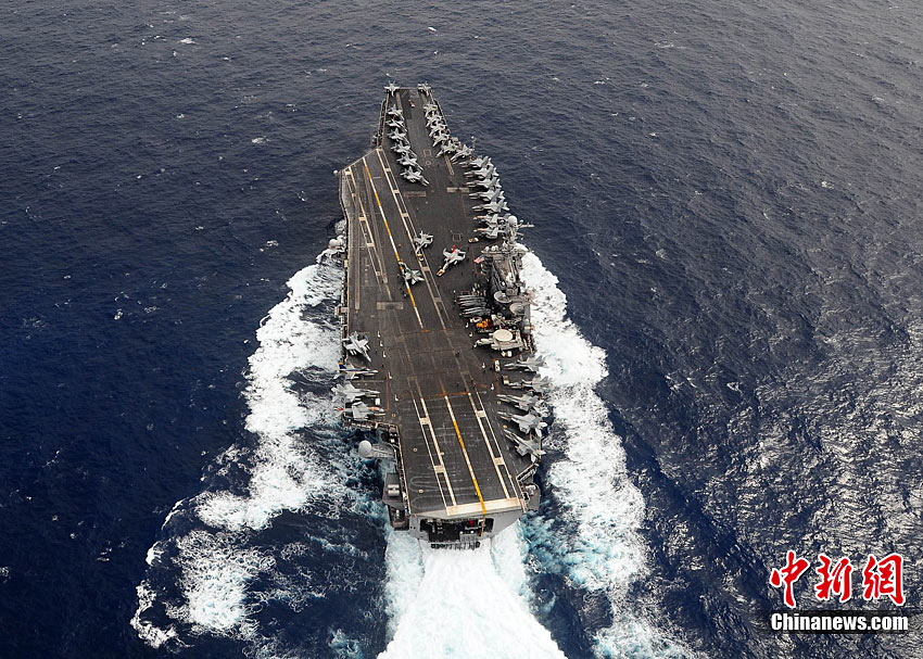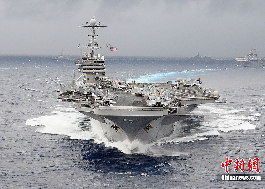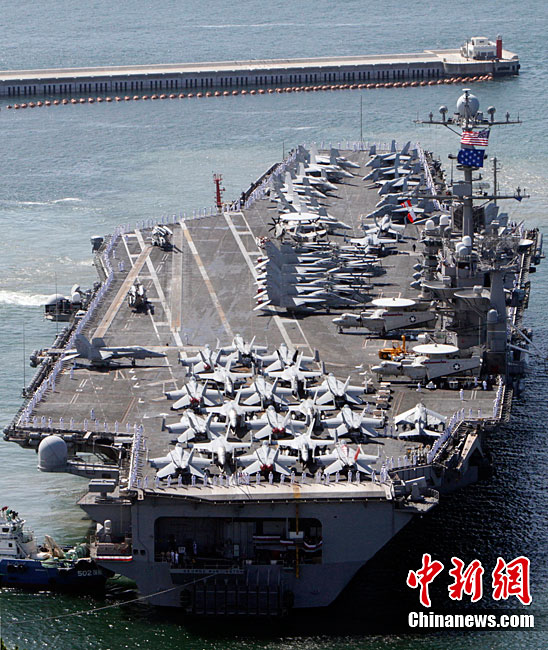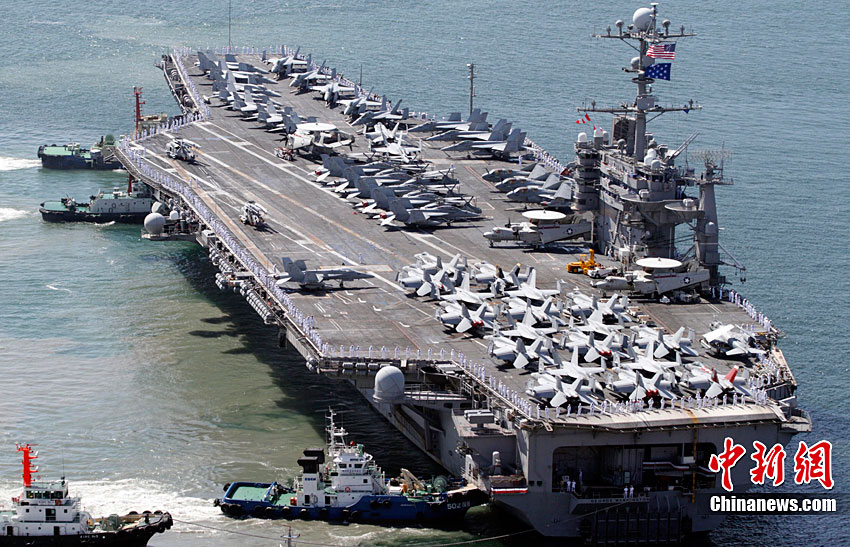11月28日,韓美聯合軍事演習在黃海海域舉行。美軍派出“喬治·華盛頓”號航母、9600噸級巡洋艦及9750噸級驅逐艦參加演習。韓軍也投入7600噸級“世宗大王”艦、兩艘4500噸級驅逐艦以及巡邏艦、護航艦、戰斗支援艦和反潛飛機等參加演習。圖為11月17日,美國“喬治·華頓頓”號航母在日本沖繩附近演習。
