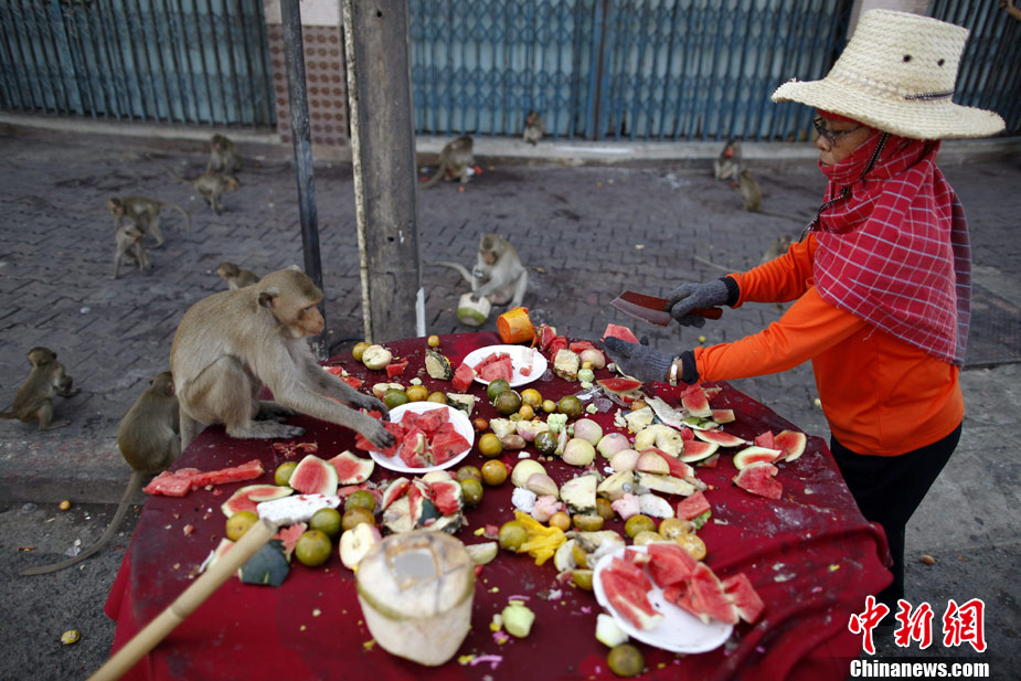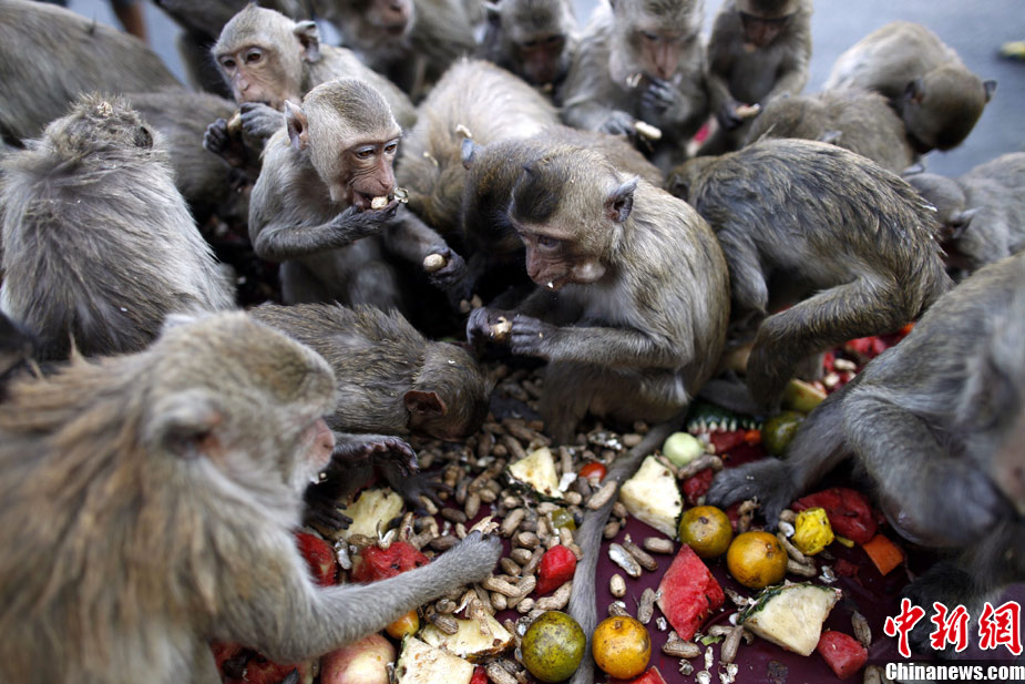 11月28日,泰國華富里,一年一度的“猴子的宴會”活動在當地舉行。猴子們可以盡情享用超過4000公斤的水果和蔬菜。華富里以猴子眾多聞名,猴子們每年都為當地吸引來大量觀光客。