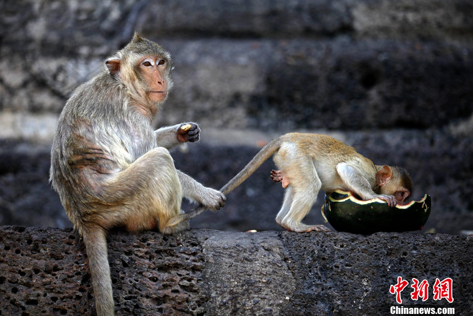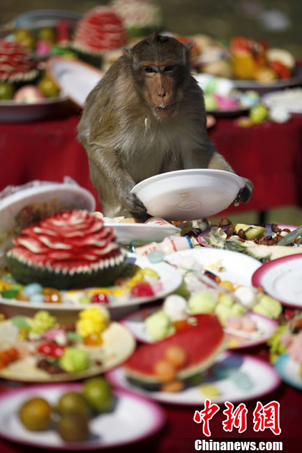 泰國舉辦猴子“宴會” 猴子餐桌大快朵頤