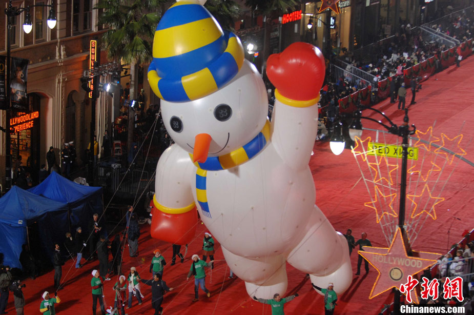 11月28日晚,一年一度的好萊塢迎圣誕大游行在好萊塢大道隆重舉行。CNN王牌主播拉里·金擔任今年游行的大禮官,在他的率領下,近60名好萊塢明星和14個樂隊、8個騎馬方陣、巨型充氣卡通、花車等游行隊伍依次通過紅地毯,為洛杉磯迎圣誕活動拉開大幕。好萊塢迎圣誕大游行始于1928年,至今已有80多年歷史。中新社發 張煒 攝