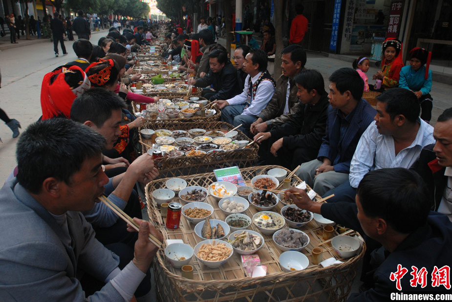 11月30日,有“天下第一宴”、“世界最長(zhǎng)的宴席”美稱(chēng)的云南綠春哈尼族長(zhǎng)街宴于在云南綠春縣開(kāi)宴,來(lái)自海內(nèi)外上萬(wàn)名游客參加了今年的長(zhǎng)街宴。此次長(zhǎng)街宴共設(shè)1860桌全長(zhǎng)近2000米。云南綠春哈尼長(zhǎng)街宴于2008年以3050桌全長(zhǎng)4000米被上海吉尼斯認(rèn)證為“世界最長(zhǎng)的宴席”。中新社發(fā) 任東 攝