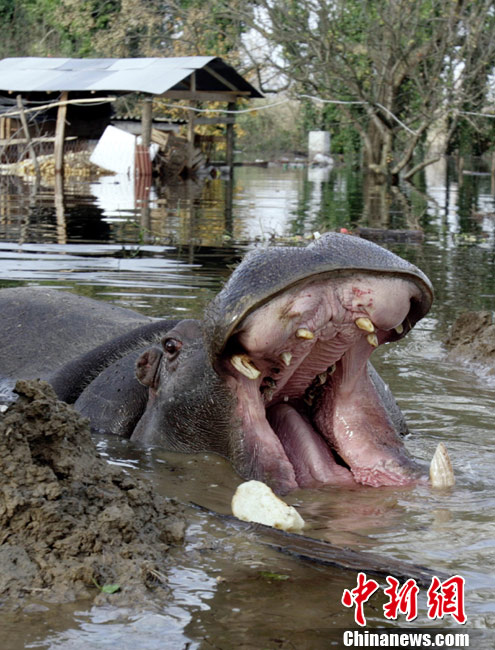 巴爾干半島西部連日來頻遭大雨侵襲,造成波斯尼亞和黑塞哥維那、塞爾維亞、黑山和阿爾巴尼亞的許多地區洪水泛濫,數千人被迫撤離家園。圖為6日,在黑山的普拉夫尼察,一頭從動物園中逃出的河馬在洪水中游泳。