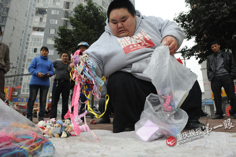 “走,出去擺哈地?cái)偅顒右幌拢 背赃^午飯后,梁用打開病房的衣柜,提出一大包鑰匙鏈、手機(jī)鏈、耳環(huán)、頭花等小飾品。梁用的出現(xiàn),猶如明星一般,“看,又是哪個(gè)胖娃!”不少人圍了過來。記者守候了半個(gè)多小時(shí),發(fā)現(xiàn)大多顧客并非沖著飾品而來,而是被梁用巨大的體型吸引來的。