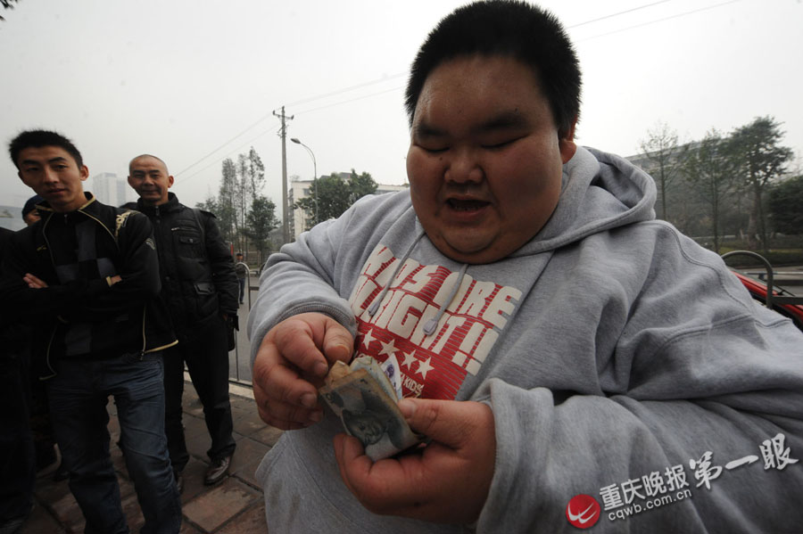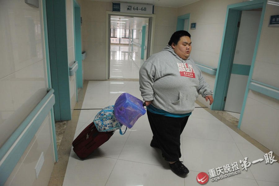 醫(yī)生介紹,入院前梁用有225公斤,目前體重保持在175公斤左右。“他減肥的毅力不夠,不能完全按醫(yī)生的規(guī)定執(zhí)行。”醫(yī)生說,今年中秋梁用請假回家,那知短短一周體重就反彈了15公斤。“再也不敢那樣了,如果達(dá)到手術(shù)指標(biāo),早點(diǎn)手術(shù)當(dāng)然好喲!”嘿嘿直笑的梁用稱,他再也不敢輕易出院了。