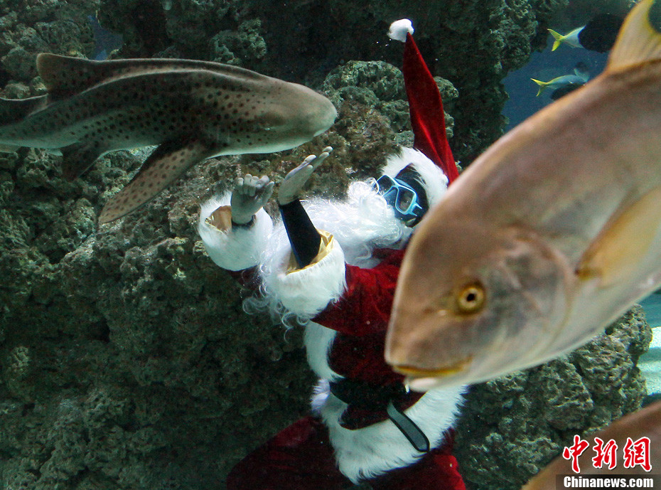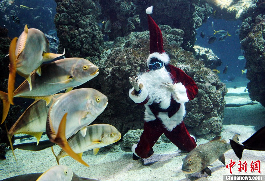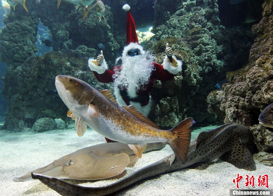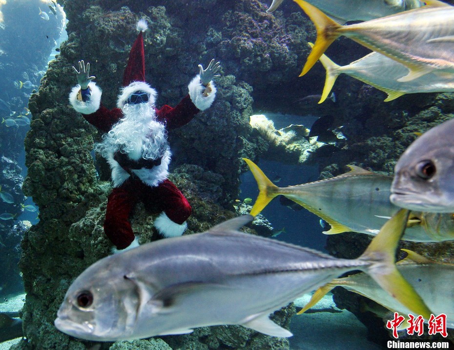 12月17日,摩納哥水族館內,自由潛水世界紀錄保持者弗若拉打扮成圣誕老人,在水下與魚兒親密接觸迎接圣誕節。