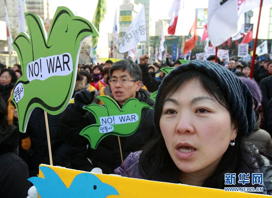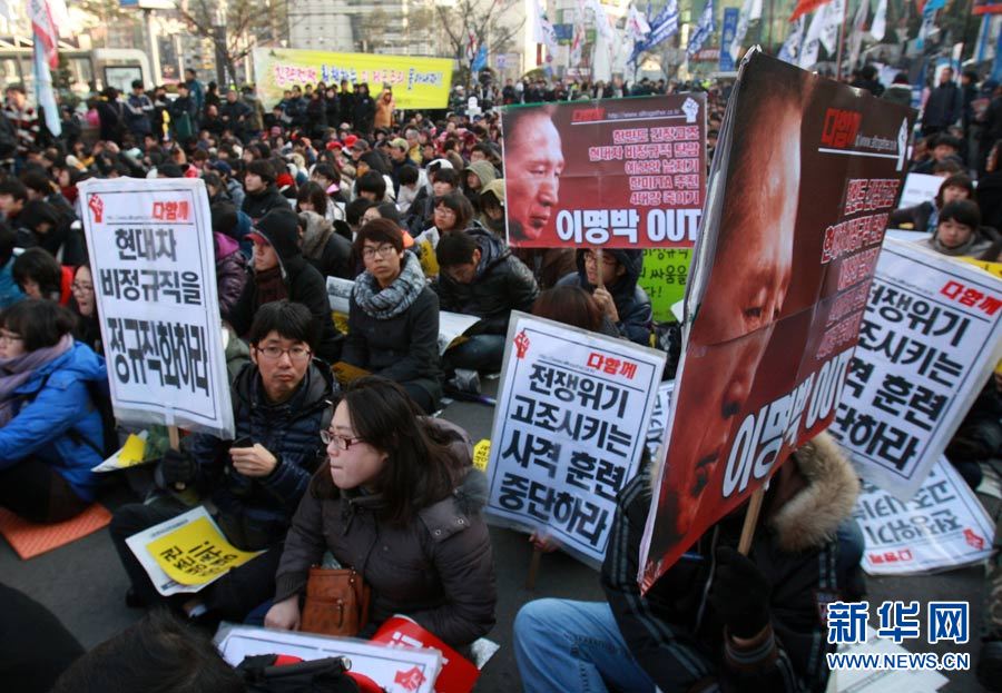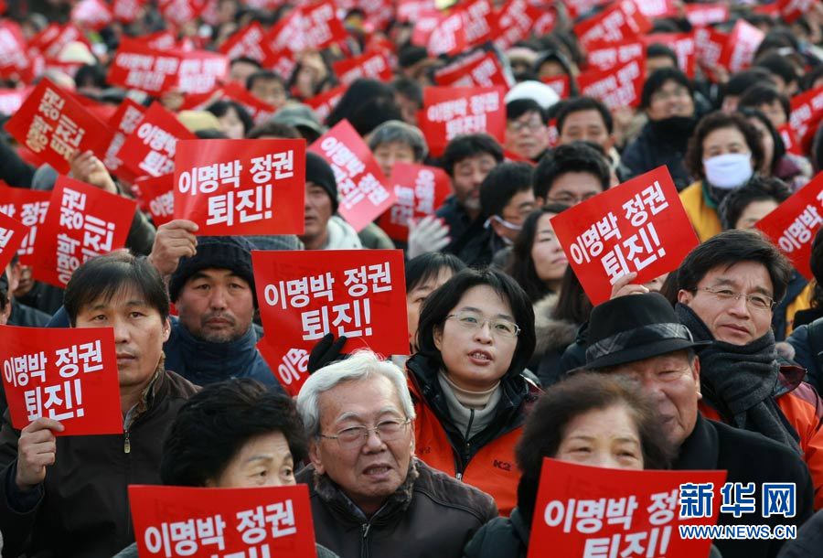 12月18日,在韓國(guó)首爾火車站,人們手舉標(biāo)語(yǔ),高喊口號(hào),要求李明博政府下臺(tái)。當(dāng)日,數(shù)千名韓國(guó)民眾在首爾舉行抗議,要求李明博政府下臺(tái)。韓國(guó)政府16日宣布將在18日至21日之間的某一天在延坪島海域舉行海上實(shí)彈射擊訓(xùn)練。樸真熙攝 圖片來(lái)源:新華網(wǎng)
