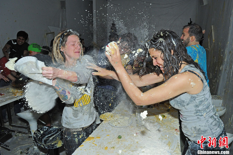 2010年12月18日,人們?cè)谟?guó)倫敦一家畫(huà)廊中參加圣誕食物大戰(zhàn)活動(dòng)。在活動(dòng)中人們用甘藍(lán)、土豆泥、果凍及奶油等食品互相“攻擊”,此活動(dòng)的門(mén)票收入將捐獻(xiàn)給慈善機(jī)構(gòu)。