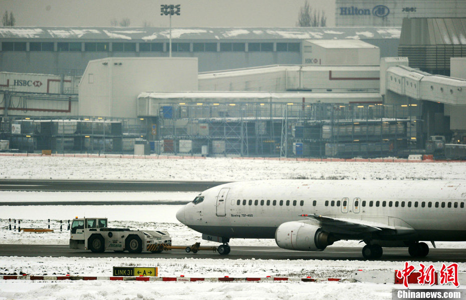 12月21日,在英國(guó)倫敦希思羅機(jī)場(chǎng),一架飛機(jī)被拖車從停機(jī)坪上拖過(guò)。