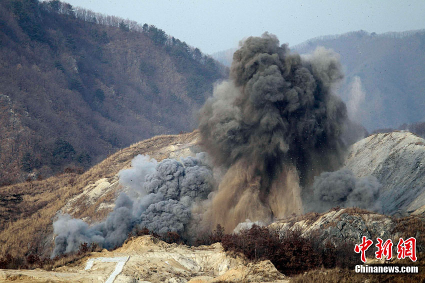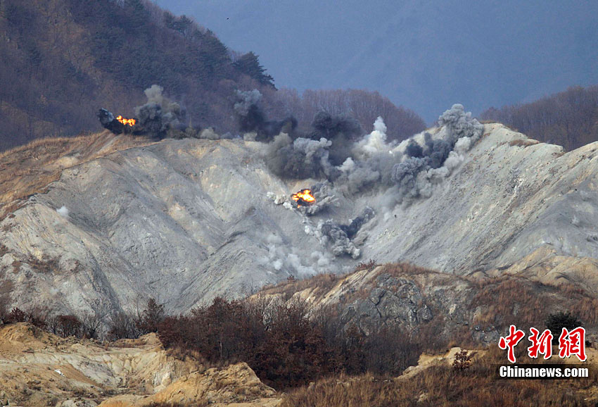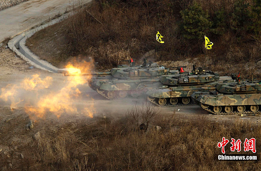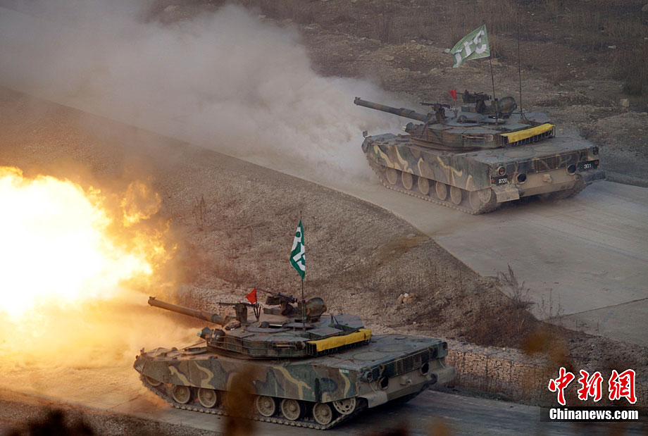 當?shù)貢r間12月23日下午2時43分,韓國軍方最大規(guī)模的陸空聯(lián)合實彈射擊演練開始。據(jù)悉,此次演習投入800名官兵,動員6架F-15K和KF-16戰(zhàn)斗機、K-1戰(zhàn)車、AH-1S攻擊型直升機、K-9自走炮、反戰(zhàn)車導彈和多管火箭發(fā)射系統(tǒng)等105種火力裝備。圖為AH-1S攻擊型直升機在進行射擊。