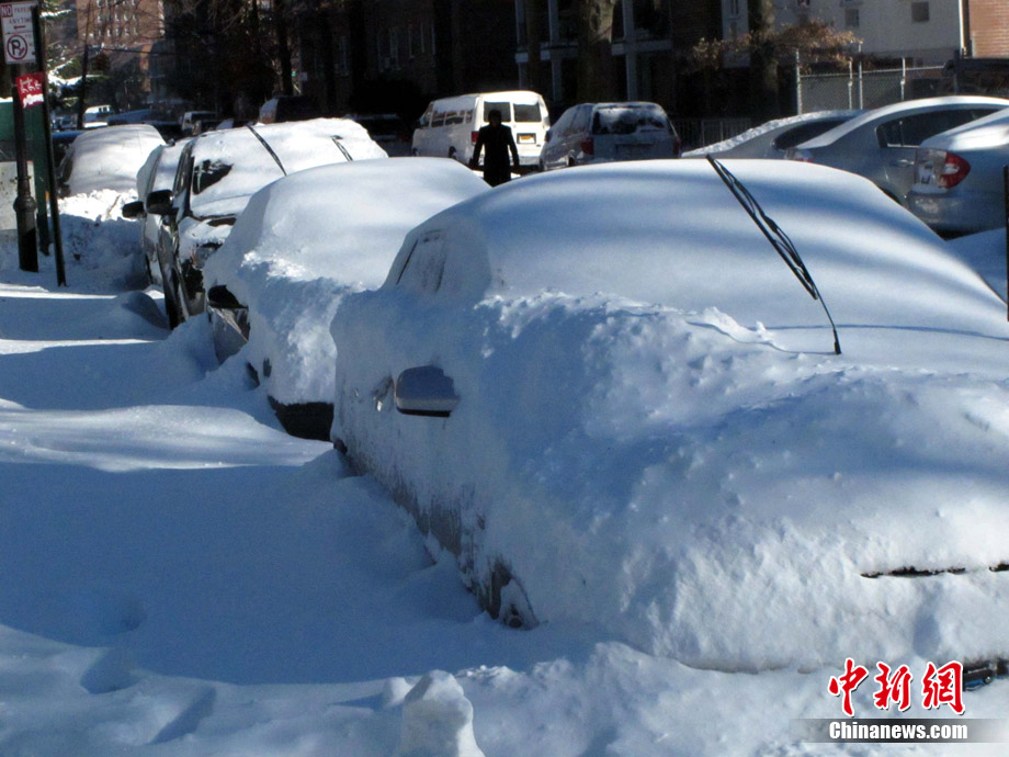2010年12月27日,美國紐約,停在路邊的車輛陷入雪堆。暴風雪26日襲擊美國東海岸,紐約市區積雪達到50厘米,全市交通陷入困境。 中新社記者 孫宇挺 攝