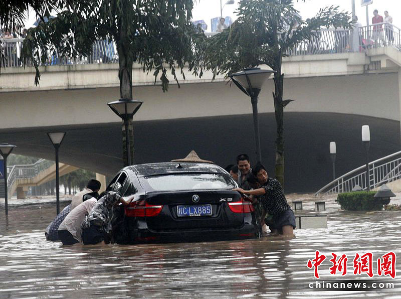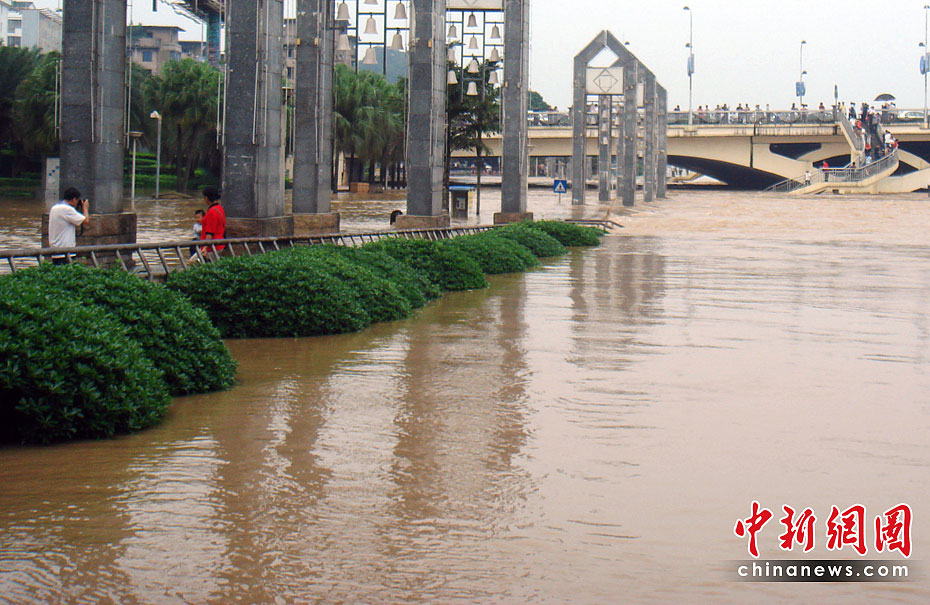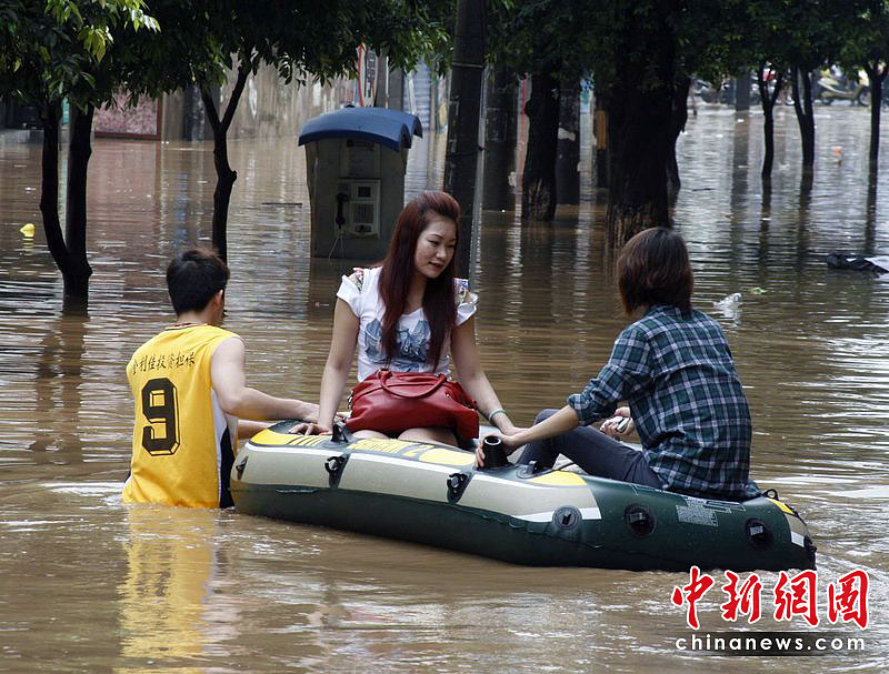 2010年6月17日,廣西桂林市出現大到暴雨、局部大暴雨天氣。漓江洪水倒流入市區,市民坐竹排出行。東華/CFP