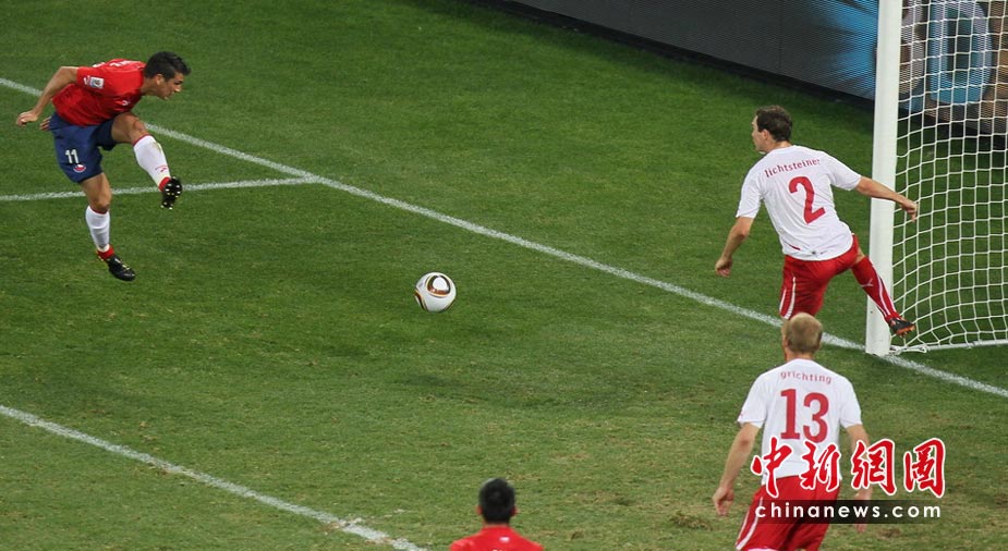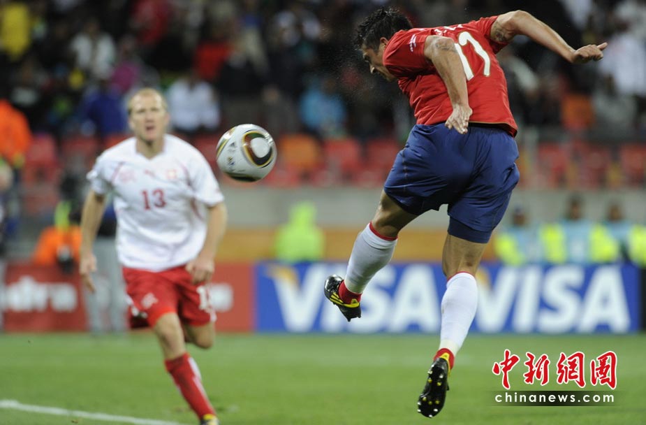 6月21日,世界杯H組第2輪首戰在伊麗莎白港納爾遜-曼德拉灣球場展開較量。瑞士中場貝赫拉米連續肘擊兩人,被紅牌罰下后,以十人應戰的他們在下半場被智利隊岡薩雷斯打入一球,以0-1告負。