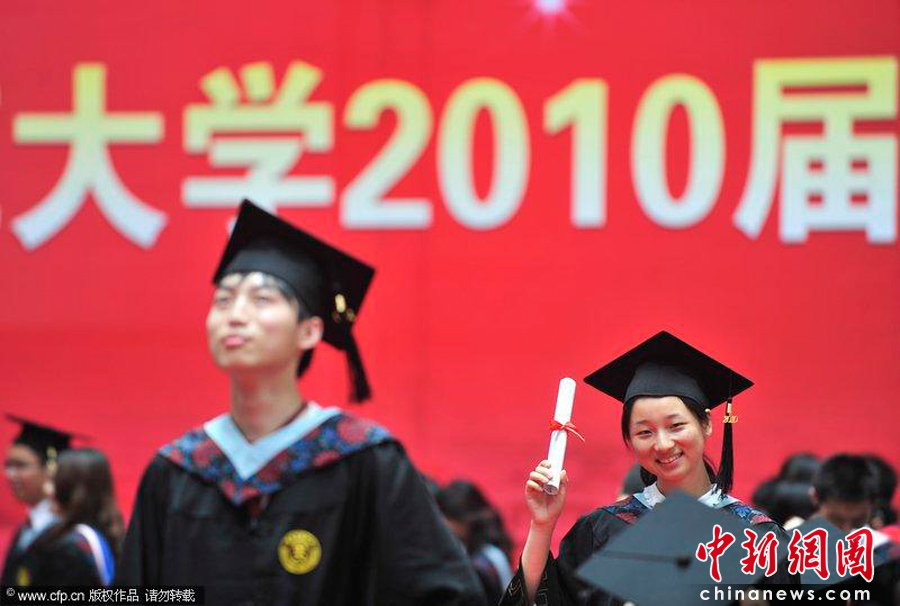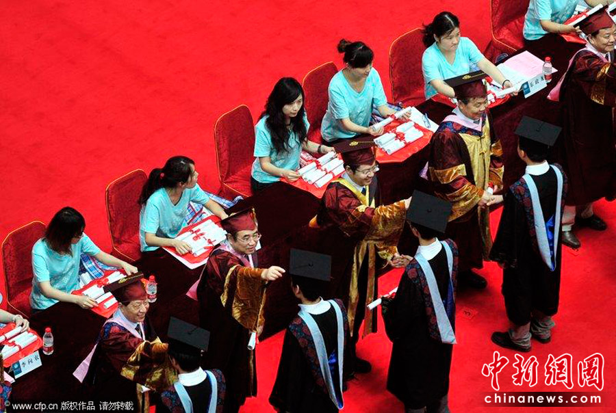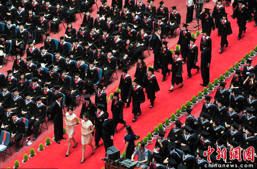 2010年6月24日,華中師范大學在該校佑銘體育館舉行2010屆畢業生畢業典禮暨學位授予儀式,3177名本科生莊嚴宣誓。儀式授予現場,校方精心為畢業生準備了“奧斯卡似的學位授予典禮”:40多米長的紅地毯兩側攝影機、相機嚴陣以待,4名男生筆直站立“警戒”,校禮儀隊的女生為身穿學士學位服的畢業生們引路。Shepherd C.Zhou/CFP