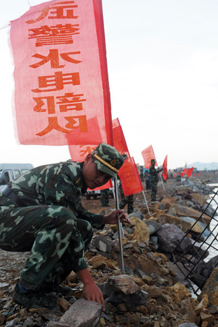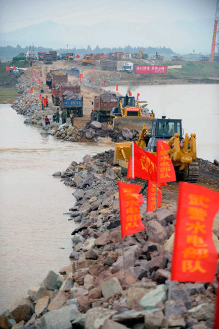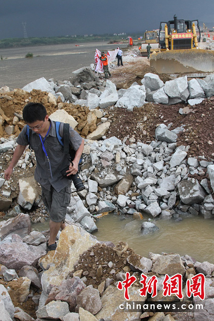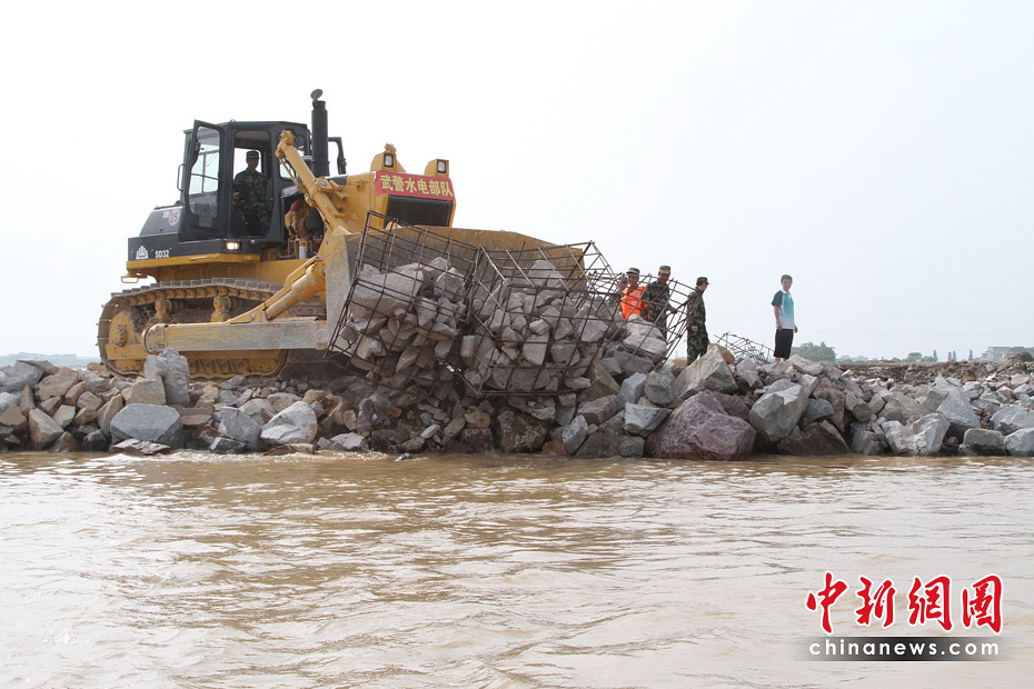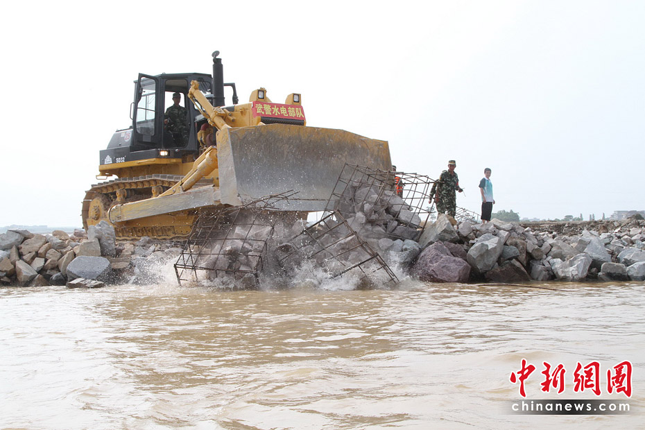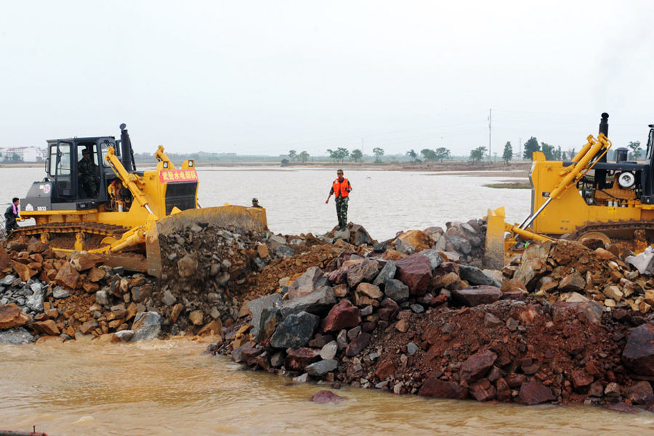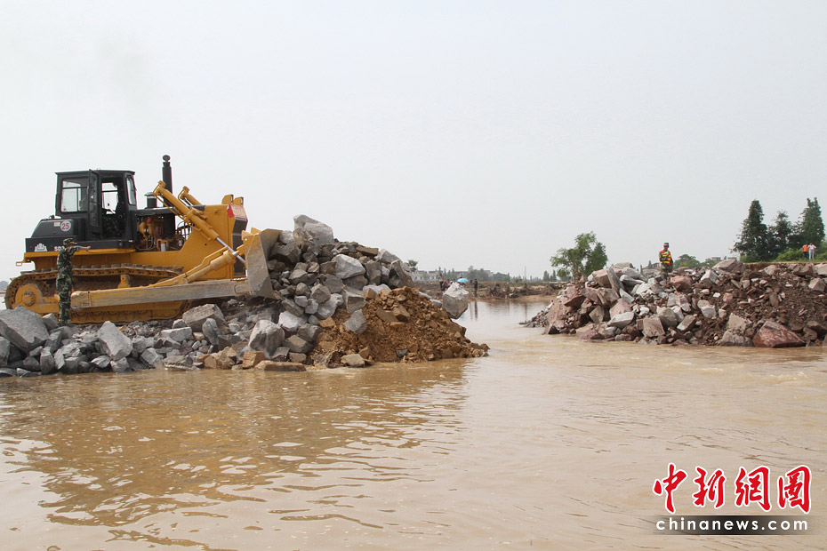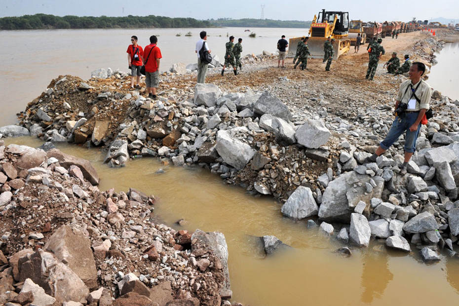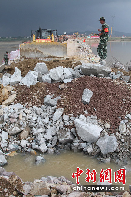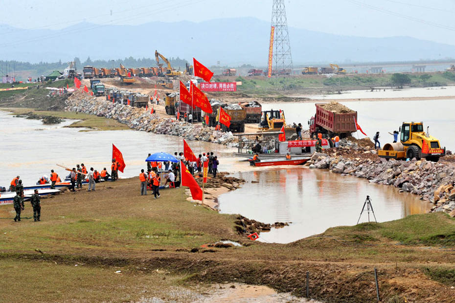 隨著最后一車土石投入河道,決口6天的江西撫州唱?jiǎng)P大堤終于合龍,恢復(fù)了它完整的堤身。原計(jì)劃6天完成的決口封堵任務(wù)提前3天完成。圖片來(lái)源:新華網(wǎng) 章武 攝