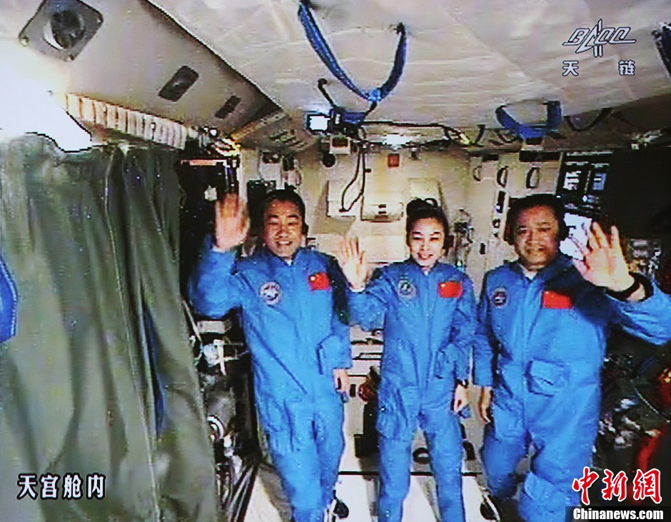 6月20日10時許,神舟十號航天員在天宮一號開展基礎物理實驗,為青少年進行中國首次太空授課。圖為神舟十號航天員授課前與大家招手致意。中新社發 秦憲安 攝