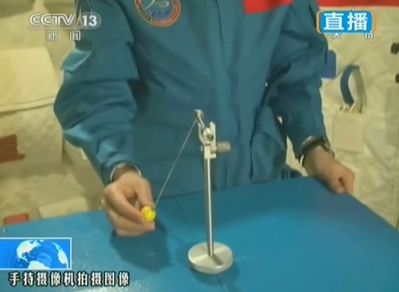 6月20日上午10時許,神舟十號航天員進行中國首次太空授課,女航天員王亞平擔任主講,成為中國首位“太空教師”。圖為王亞平做“小球實驗”。(視頻截圖)