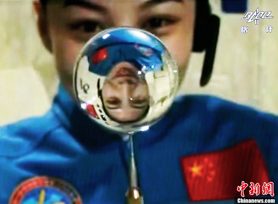6月20日10時許,神舟十號航天員在天宮一號開展基礎(chǔ)物理實驗,為青少年進行中國首次太空授課。圖為王亞平講授太空失重提供條件下的水球演示。中新社發(fā) 秦憲安 攝