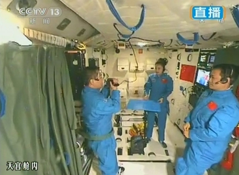 6月20日上午10時(shí)許,神舟十號(hào)航天員進(jìn)行中國(guó)首次太空授課,女航天員王亞平擔(dān)任主講,成為中國(guó)首位“太空教師”。(視頻截圖)