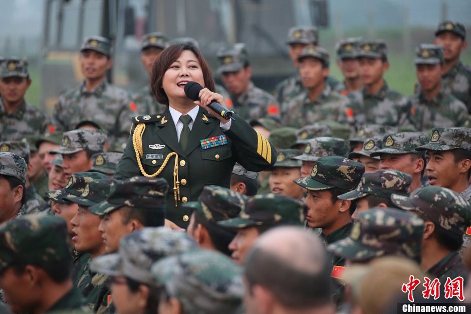 8月10日,隨同中方參演部隊赴俄羅斯參加“和平使命-2013”中俄聯(lián)演的沈陽軍區(qū)政治部文工團演員們,為中俄千余名參演官兵獻上了一場精彩的文藝晚會。豐富多彩的文藝節(jié)目,將位于切巴爾庫爾訓(xùn)練場的中俄聯(lián)演野營村,變成了友誼的盛會、歡樂的海洋。 圖為演唱歌曲《當那一天來臨》。中新社發(fā) 李祥輝 攝