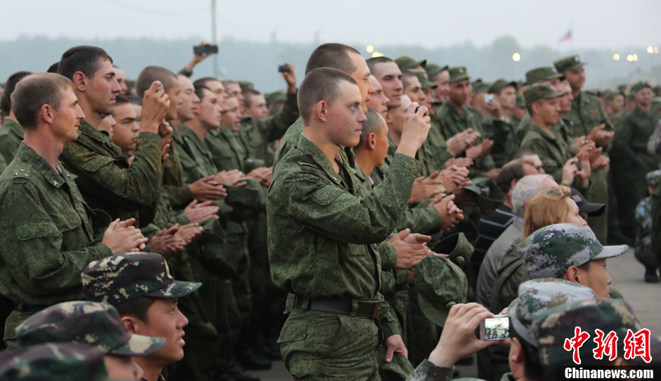 8月10日,隨同中方參演部隊赴俄羅斯參加“和平使命-2013”中俄聯(lián)演的沈陽軍區(qū)政治部文工團演員們,為中俄千余名參演官兵獻上了一場精彩的文藝晚會。豐富多彩的文藝節(jié)目,將位于切巴爾庫爾訓練場的中俄聯(lián)演野營村,變成了友誼的盛會、歡樂的海洋。圖為精彩節(jié)目吸引俄國官兵。中新社發(fā) 李祥輝 攝