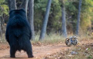 黑熊站立對視老虎