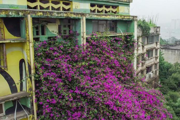 5月25日,重慶市九龍坡區黃桷坪涂鴉藝術街,一居民樓盛開的三角梅從8樓傾瀉至地面,高近30米,遠望如“花瀑”流淌,形成一道靚麗風景線。蔣杭佳 攝