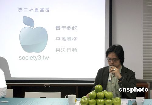 臺灣第三社會黨十八日公布青蘋果造型的黨徽,象征“青年參政,平民風(fēng)格,果決行動”。第三社會黨籌備處負(fù)責(zé)人周奕成(圖中講話者)表示,青蘋果構(gòu)想來自知名律師陳長文。中新社發(fā) 耿軍 攝
