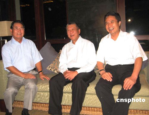 十月二十九日,澳門特別行政區(qū)行政長官何厚鏵率澳門政府代表團和澳門房地產(chǎn)企業(yè)家代表團一行一百五十四人訪問海南三亞。中共海南省委書記衛(wèi)留成(左)、海南省長羅保銘(右)當(dāng)天在三亞希爾頓大酒店會見并宴請了何厚鏵一行。中新社發(fā) 尹海明 攝