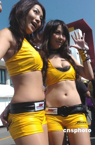 十一月十七日,在澳門舉行的第五十四屆澳門格蘭披治大賽車上美女如云。圖為新葡京安排的賽車女郎將現場氣氛推向高潮。中新社發 史利 攝