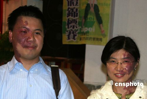 十二月五日,LG杯世界圍棋賽冠軍、臺灣“紅面棋王”周俊勛應邀出席臺北市學生圍棋團體錦標賽,現場一位“紅面”女子與其合影留念,相映成趣。中新社發 董會峰 攝