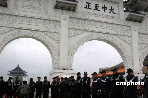 十二月五日,臺(tái)北“中正紀(jì)念堂”牌樓“大中至正”四字將拆除引發(fā)的風(fēng)波升級(jí),現(xiàn)場(chǎng)爆發(fā)數(shù)波零星沖突。圖為臺(tái)灣當(dāng)局調(diào)來(lái)上百名警察嚴(yán)陣以待。中新社發(fā) 董會(huì)峰 攝