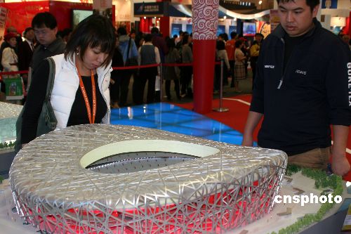十二月十四日,第二屆海峽兩岸臺北旅展在臺北世貿展館開幕。圖為奧運和世博展區內的北京奧運會主場館“鳥巢”模型,吸引觀眾駐足欣賞。中新社發 董會峰 攝