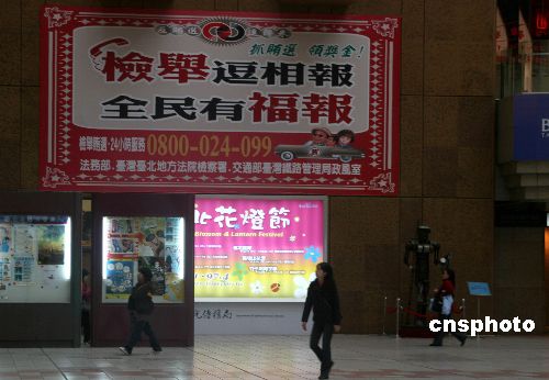 一月七日,距臺灣第七屆“立委”選舉投票日只有五天,選戰日趨激烈。臺灣檢方也加強抓賄選的街頭宣傳,圖為臺北火車站售票大廳內懸掛的檢舉抓到賄選可領獎金的巨幅廣告。中新社發 陳立宇 攝