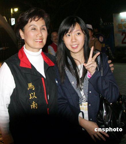 一月十日晚,馬英九大姐馬以南出席“立委”候選人周守訓拉票造勢晚會,為周參選加油、打氣,圖為現場一位馬英九的支持者與她合影。臺灣“立委”選舉在即,選戰已進入白熱化。中新社發 孫自法 攝
