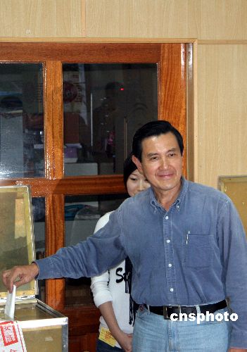 一月十二日是臺灣第七屆“立委”選舉日,當天下午,中國國民黨臺灣二00八年“大選”參選人馬英九前往投票場所投票。中新社發 孫自法 攝