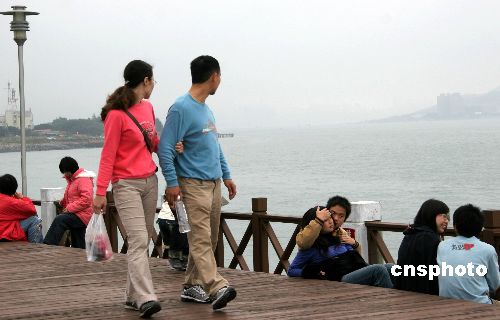 一月二十一日,一對夫婦從臺北淡水情人橋上走過,不約而同將視線轉向橋邊甜蜜相會的一對對情侶。淡水情人橋位于臺北淡水河入海口的漁人碼頭,是觀海、休閑和情侶約會的好去處。中新社發 孫自法 攝