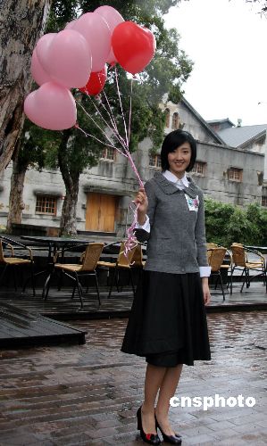 一月二十六日,臺灣年輕藝人桂綸鎂在臺北街頭拍攝廣告。微風細雨、老樹桌椅、美女氣球,別具風情。中新社發 孫自法 攝