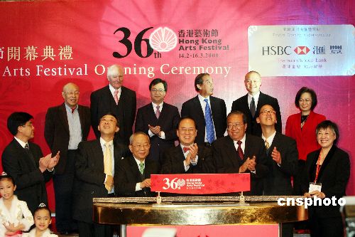 二月十四日晚,香港特別行政區行政長官曾蔭權(前排右四)等在香港文化中心出席二零零八年香港藝術節開幕禮。來自全球三十一個藝術團的頂尖藝術家將在藝術節期間為觀眾帶來各具特色的藝術盛宴。中新社發 武仲林 攝