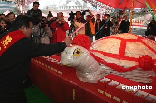 二月十五日,二00八臺北花燈節開幕,澎湖縣天后宮媽祖受邀前來。按照當地宗教傳統,澎湖人員在花燈節現場造乞龜臺一座,舉行點青官為“元宵乞龜”點青儀式。中新社發 徐長安 攝