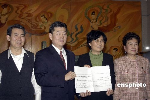 2月25日,紐約華人社團聯席會代表20多個華人社團將募集到的五萬多美元捐款委托中國駐紐約總領館轉交給中國大陸災區。圖為聯席會名譽主席喬立華(左二)和共同主席蘇殿奎(左一)等將捐款支票樣本交給郝曉飛(右二)副總領事代收。這是中國駐紐約總領館近來收到的第五筆來自美東華人華僑的捐款。中新社發 鄧悅 攝
