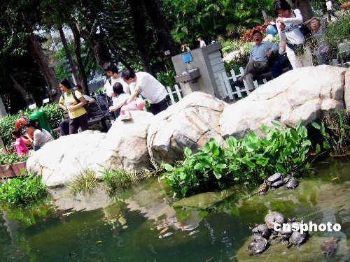三月二十九日,香港眾多市民在香港公園享受輕松時(shí)光,水池中的烏龜也浮出水面,停駐在礁石上享受春天陽(yáng)光的溫暖。中新社發(fā) 王麗南 攝